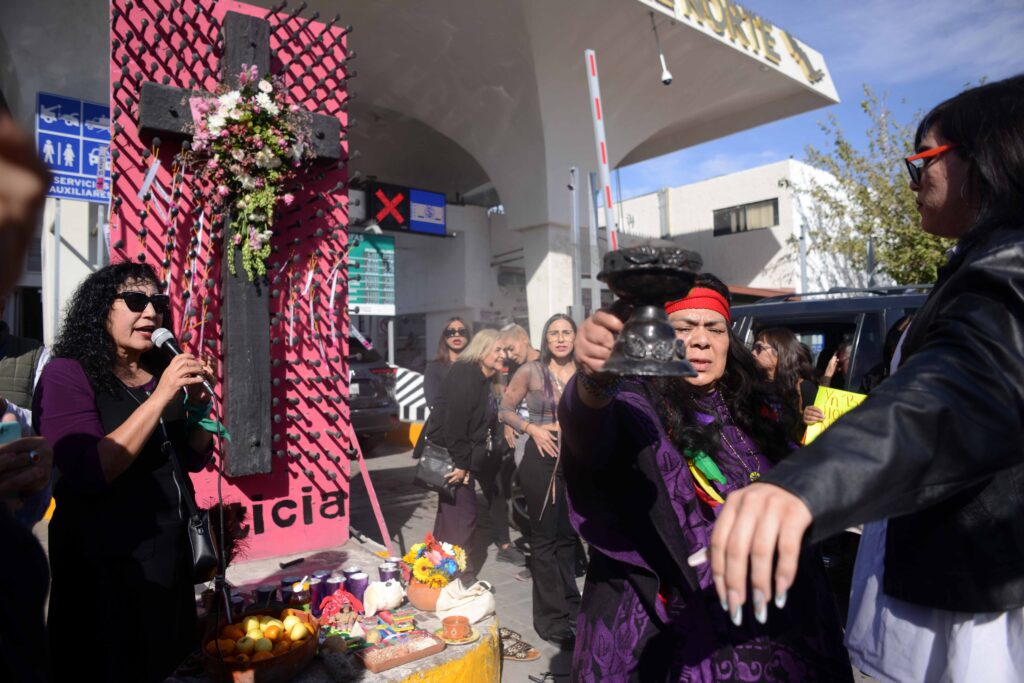 Las mujeres colocaron flores en la Cruz de Clavos colocada sobre la avenida Juárez, en el acceso a los carriles del puente internacional Paso del Norte que une al centro de la ciudad con El Paso, Texas.