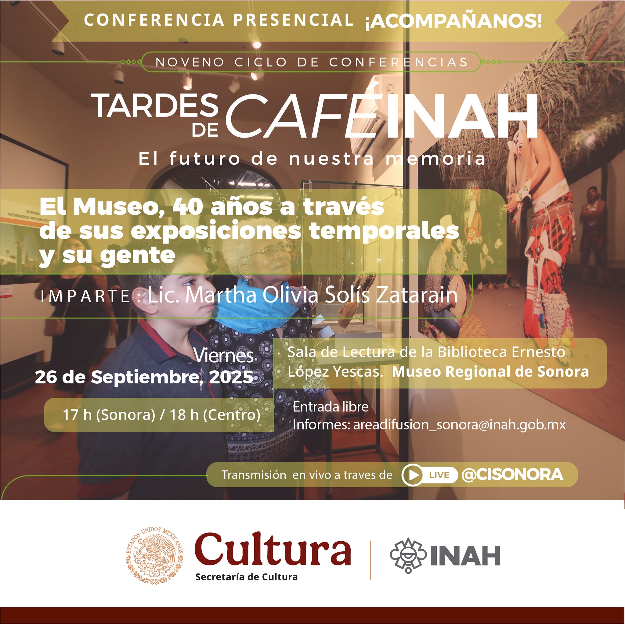 El Instituto Nacional de Antropología e Historia en Sonora invita a la presentación de la charla “El Museo, 40 años a través de sus exposiciones temporales y su gente”, a impartirse por la Lic. Martha Olivia Solís Zataraín, el próximo viernes 26 de septiembre, a las 17:00 horas en el Museo Regional de Sonora, Antigua Penitenciaría.