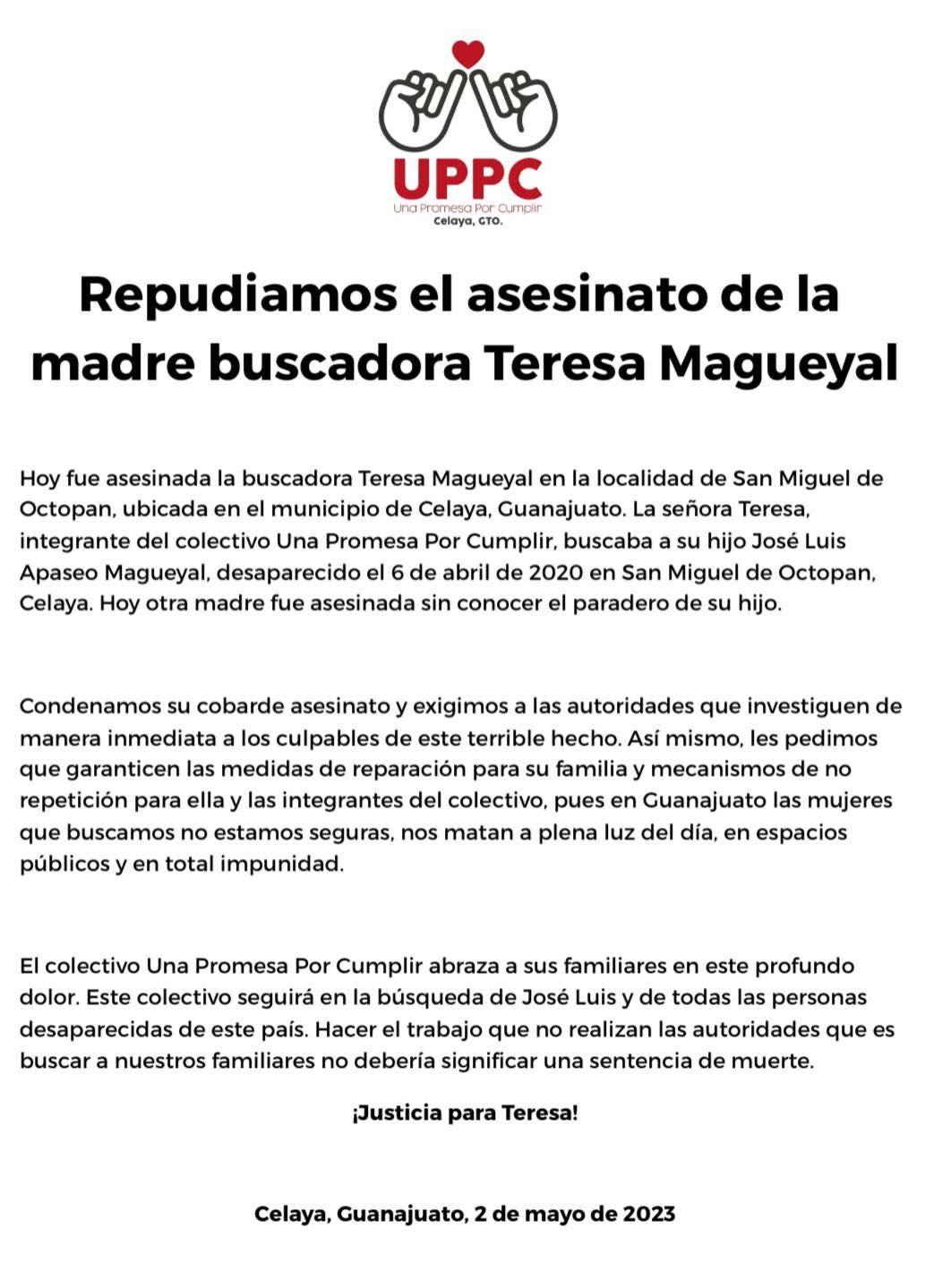 El día de hoy en la comunidad San Miguel Octopan, Celaya, Guanajuato, hombres armados asesinaron a la buscadora Teresa Magueyal, integrante del Colectivo “Una promesa por cumplir” con sede en Celaya. La señora Teresa, integrante del colectivo Una Promesa Por Cumplir, buscaba a su hijo José Luis Apaseo Magueyal, desaparecido el 6 de abril de 2020 en San Miguel de Octopan, Celaya.
