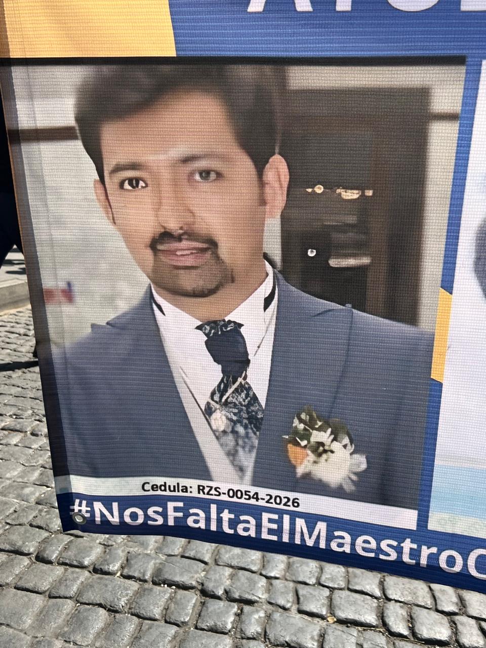 Julia, mamá de Oscar, está también en la protesta, sostiene una manta con el nombre de Oscar, de 30 años, es su único hijo varón.