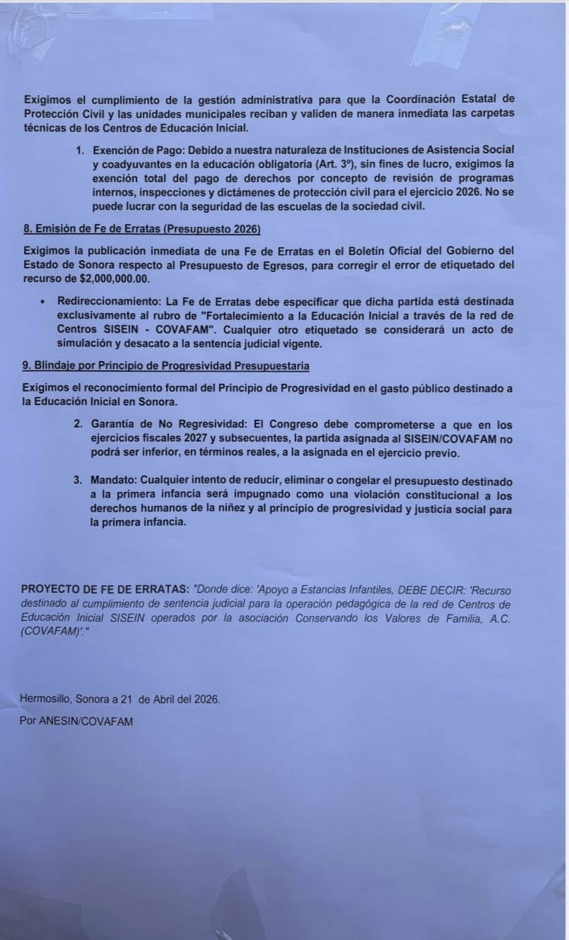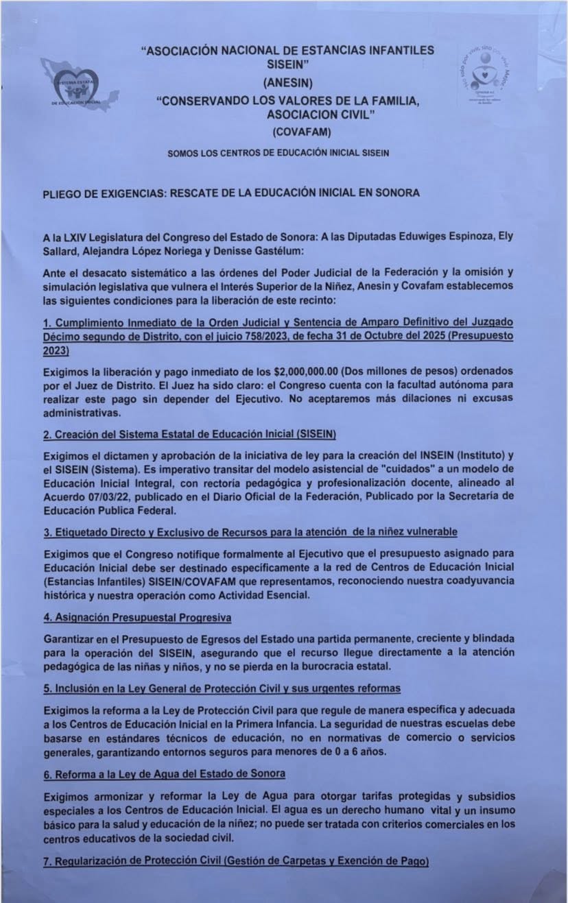 En un pliego petitorio presentado ayer por la Asociación nacional de estancias infantiles Covafam A.C. Sisein Sonora como condición para levantar la toma, la organización exige la transferencia de 2 millones de pesos de parte del Congreso, pues un juez emitió un fallo en ese sentido desde octubre del 2025.