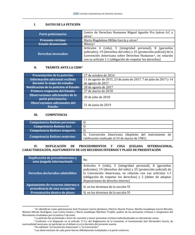 Como parte de esta lucha, en octubre de 2014 se presentó el caso ante la CIDH. El 6 de julio de 2020, dicho órgano internacional lo declaró admisible. Ahora la CIDH conocerá del fondo del caso -es decir, analizará los hechos para determinar las violaciones de derechos humanos en las que haya incurrido el Estado mexicano- con lo cual las familias buscan que la CIDH formule recomendaciones al Estado para concretar el acceso a la justicia y la no repetición.