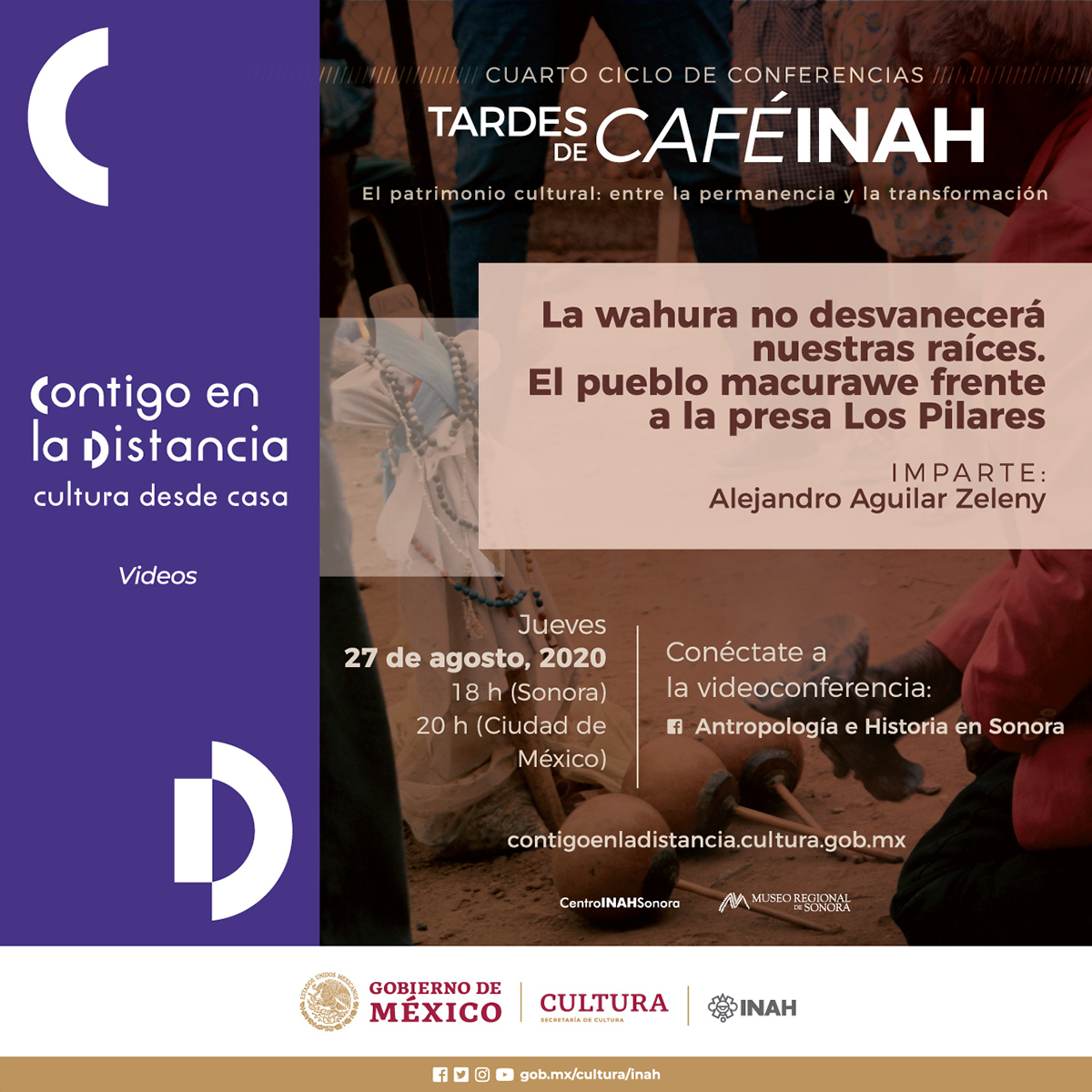 25 de agosto de 2020, Hermosillo, Sonora. – El Instituto Nacional de Antropología e Historia en Sonora, a través de su área de investigación, continúa con el ciclo de conferencias virtuales CAFÉINAH. En esta ocasión toca el turno al Antrop. Alejandro Aguilar Zeleny, quien abordará “La wahura no desvanecerá nuestras raíces. El pueblo macurawe frente a la presa Los Pilares”, a transmitirse por Facebook Live, el próximo jueves 27 de agosto del presente año, a las 18 horas.
