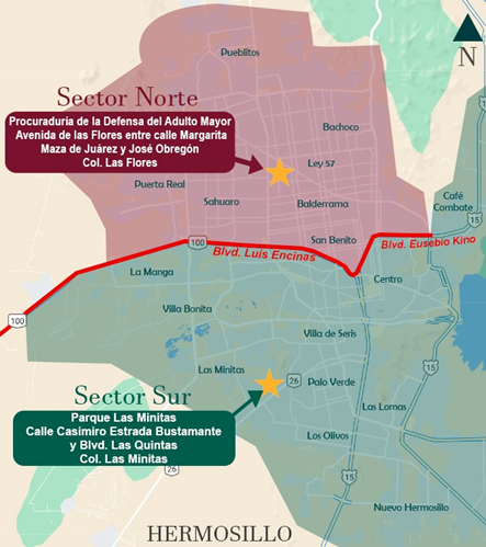En la ciudad de Hermosillo, esta actividad comenzó el pasado 27 de marzo y concluye el 30 de abril en los siguientes puntos: Para el sector Norte, corresponde en la Procuraduría de la Defensa del Adulto Mayor (PRODEAMA) ubicado en Avenida de la Flores esq. Margarita Maza de Juárez, Col. El Choyal. Y para el Sur es en el Parque de Las Minitas localizado en calle Casimiro Estrada Bustamante y Blvd. Las Quintas, Col. Las Quintas. Para facilitar la entrega a los derechohabientes que viven al Norte o al Sur, puede consultar el mapa adjunto.