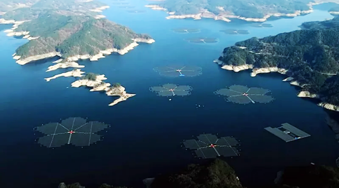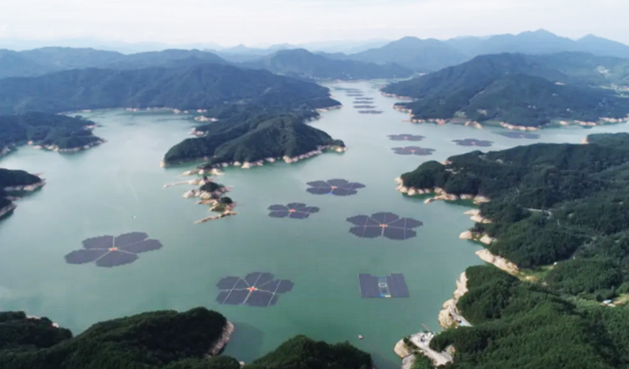 “Los tres picos de la montaña Hwangmaesan reflejados en el lago Hapcheon tienen la forma de una flor de ciruelo. Extendidos sobre la superficie de este lago hay paneles fotovoltaicos que también se asemejan a flores de ciruelo de una pintura de tinta y lavado”, dijo el presidente Moon.
