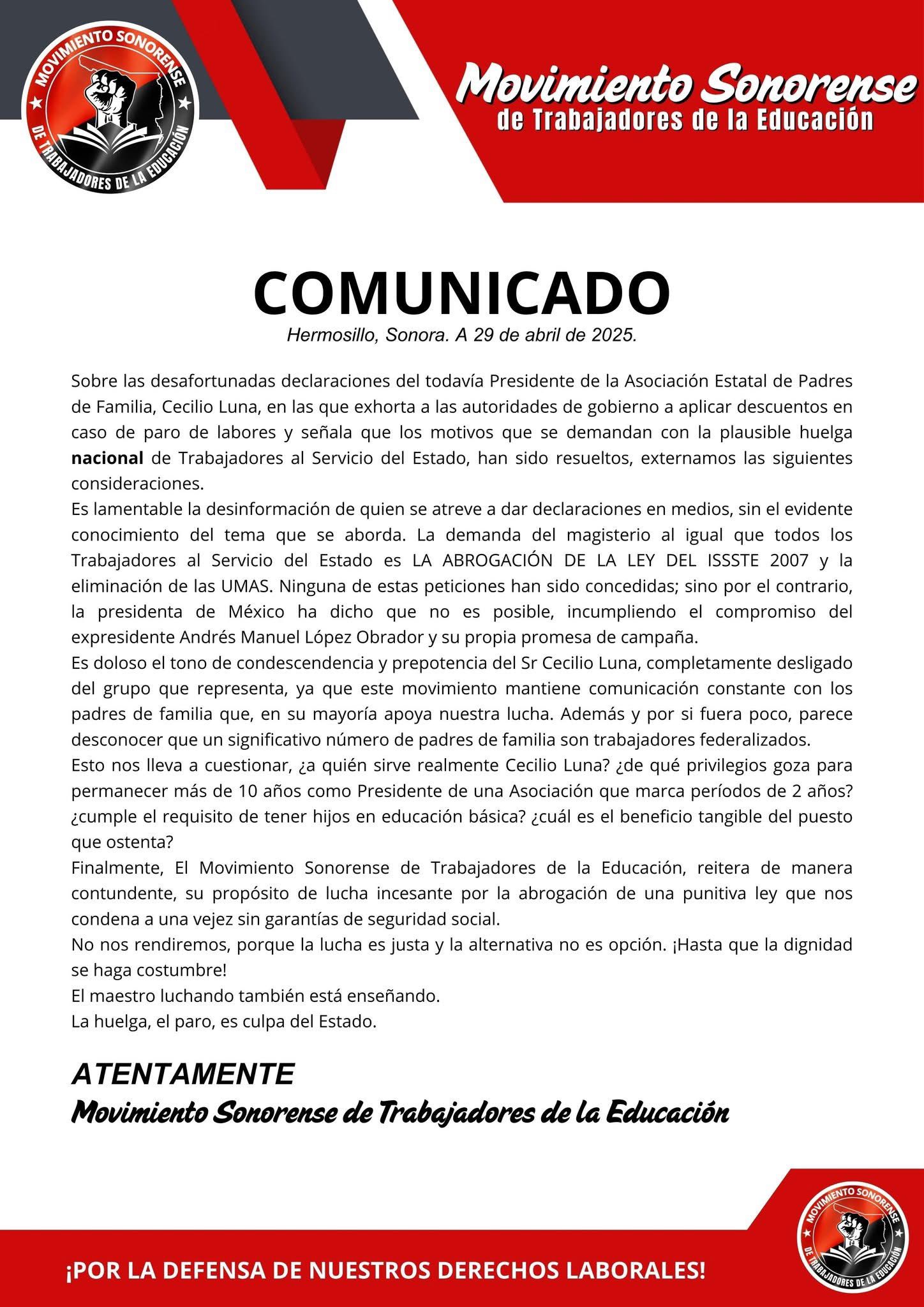 El Movimiento Sonorense de Trabajadores de la Educación emitió ayer mismo un comunicado denunciando el “tono prepotente y desligado de sus representados” del sr. Luna Salazar, y preguntan “¿A quién sirve realmente? ¿Por qué tiene 10 años de presidente de una Asociación que marca periodos de 2 años?”.
