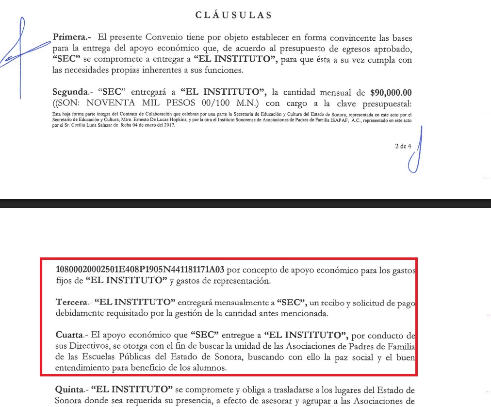 La segunda cláusula del convenio firmado por Luna Salazar y Ernesto “el Pato” de Lucas dice que recibió recursos por concepto de “apoyo económico para los gastos fijos y de representación”, y la cláusula cuarta dice que “se otorga con el fin de buscar la unidad de las Asociaciones de Padres de Familia (…) buscando con ello la paz social y el buen entendimiento para beneficio de los alumnos”. En el convenio del 2020 ya le agregan otros párrafos, pero en el mismo sentido.