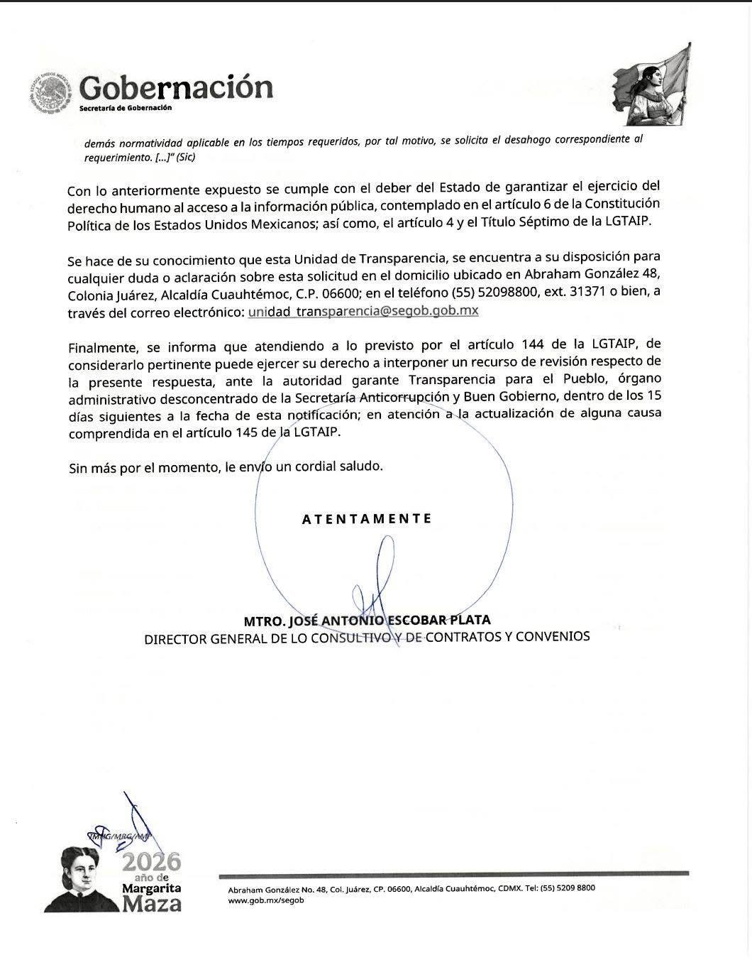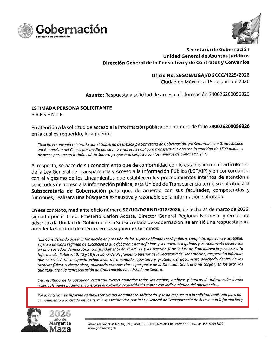 Respuesta de la Secretaría de Gobernación sobre la petición del Convenio entre Grupo México y el Gobierno Federal: