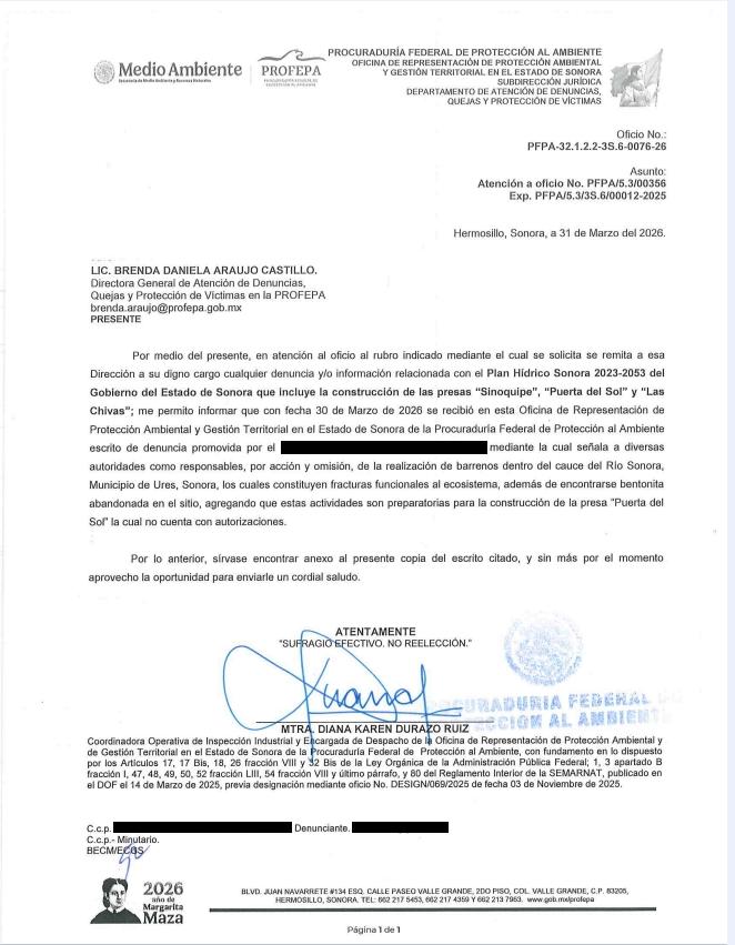 Hermosillo, Sonora, 20 de Abril de 2026.- Una denuncia fue presentada ante la Procuraduría Federal de Protección al Ambiente (PROFEPA) por presunto daño ambiental derivado de trabajos de barrenación en el cauce del Río Sonora, relacionados con el proyecto denominado “Presa Puerta del Sol”. Esto ocurrió el pasado 30 de marzo, según lo informan integrantes de los colectivos que se han opuesto a la construcción de las presas en los Ríos Sonora y San Miguel,