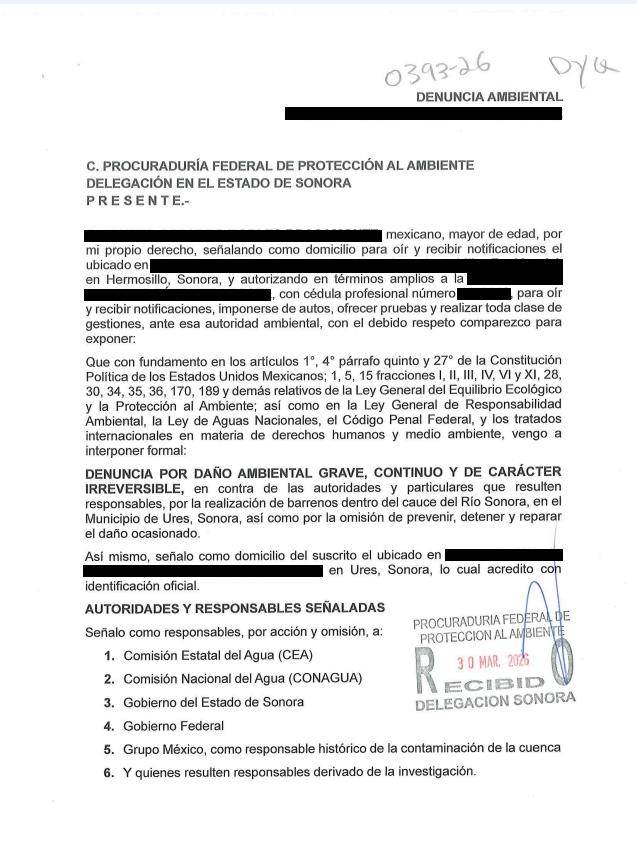 De acuerdo con el comunicado, la denuncia fue interpuesta el 30 de marzo de 2026 ante la delegación de PROFEPA en Sonora y remitida posteriormente a oficinas centrales. En ella se señala a autoridades de la Comisión Estatal del Agua (CEA), de la Comisión Nacional del Agua, del Gobierno del Estado, del Gobierno Federal y de quién resulte responsable por la ejecución de obras sin contar con la autorización en materia de impacto ambiental.
