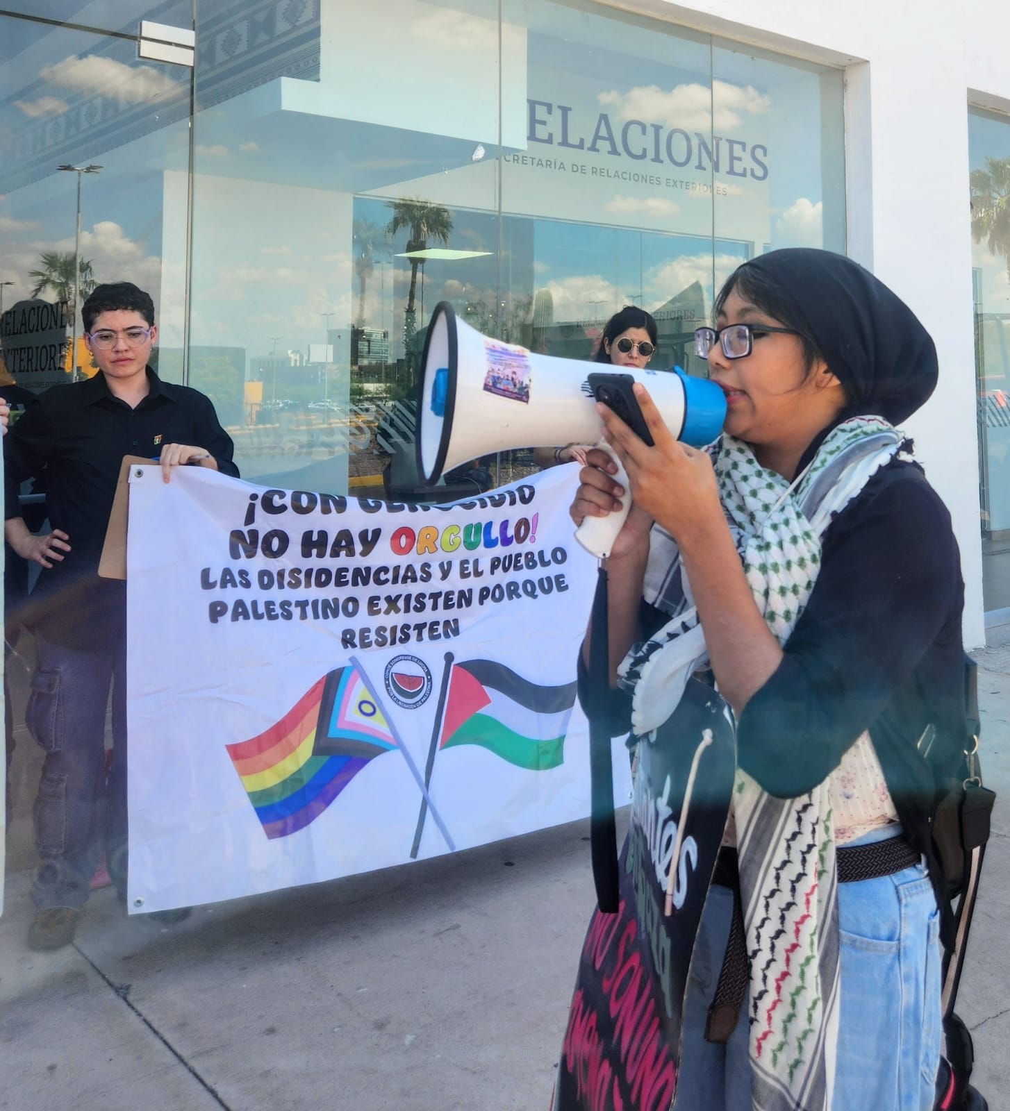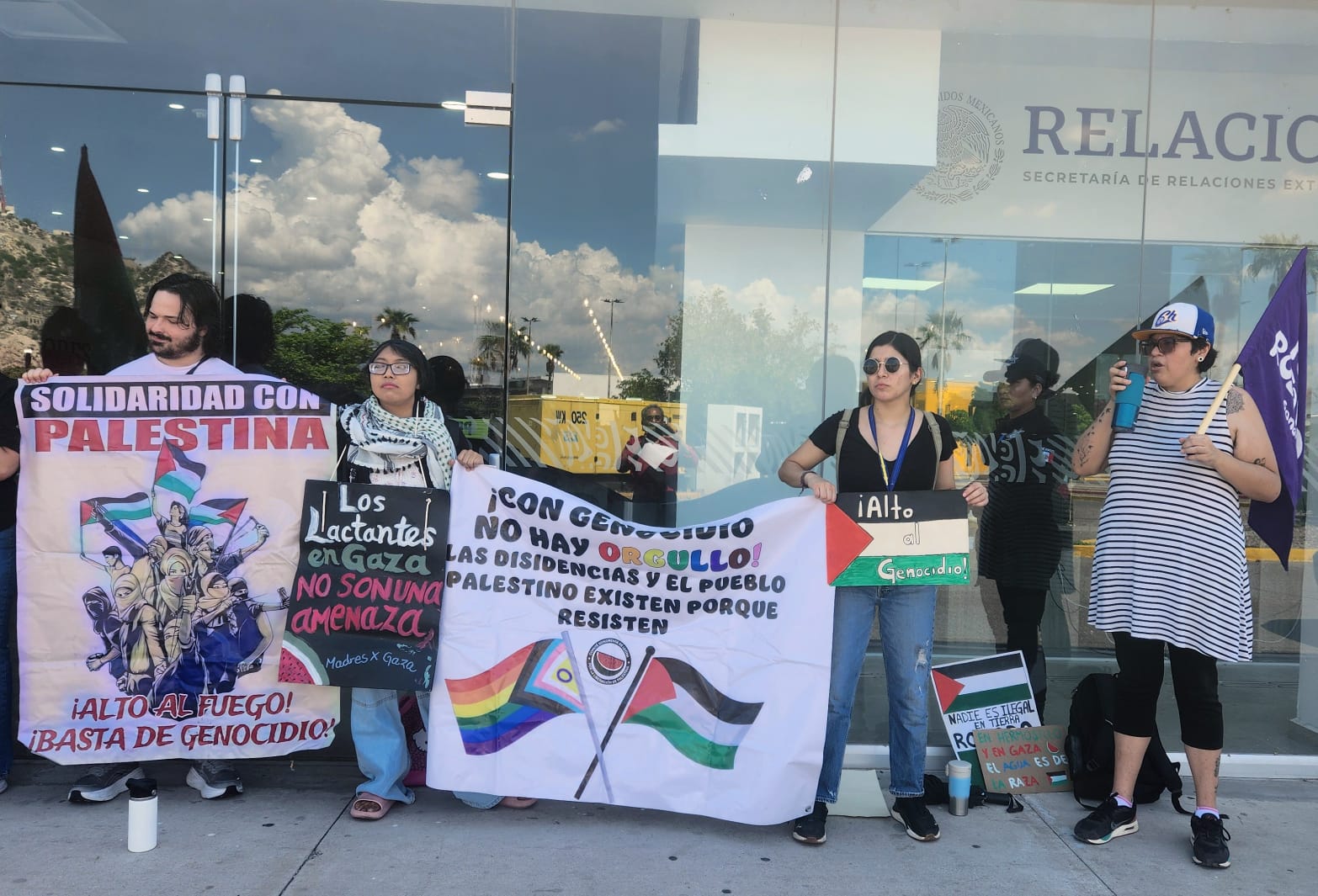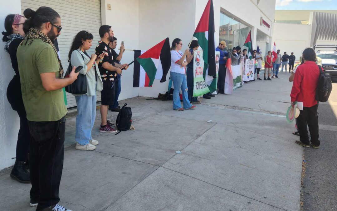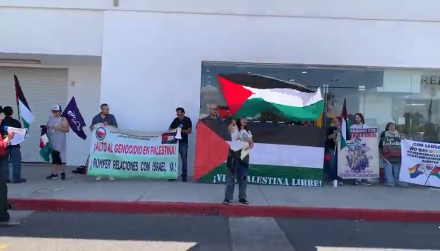 En respuesta al llamado global de l BDS (Boicot, Desinversión y Sanciones), el Comité Sonorense de Lucha por la LIberación de Palestina se manifestó este viernes 19 frente a la representación de la Secretaría de Relaciones Exteriores en Hermosillo, para exigir garantías de seguridad de la delegación mexicana en la Global Sumud Flotilla y que se rompan relaciones con Israel.
