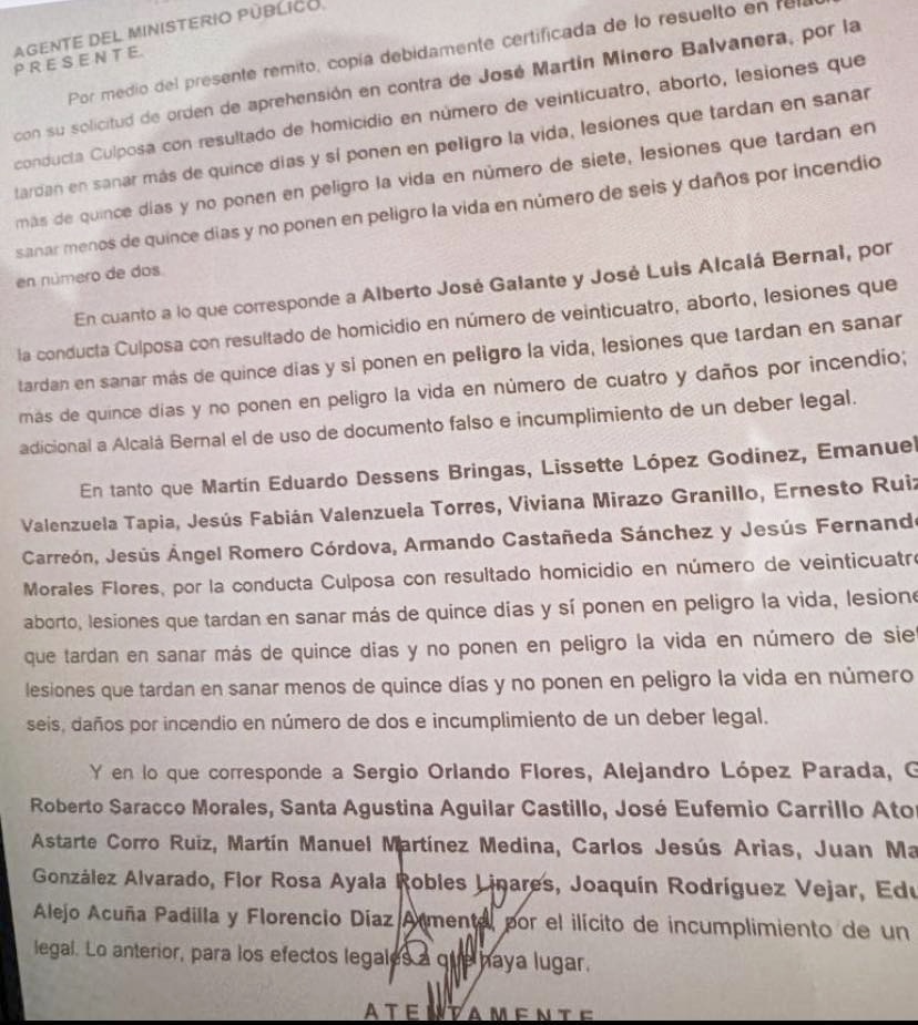 Estas dos personas serían acusadas de: Homicidio culposo en número de 24, aborto, lesiones, daños por incendio, incumplimiento de deber legal.