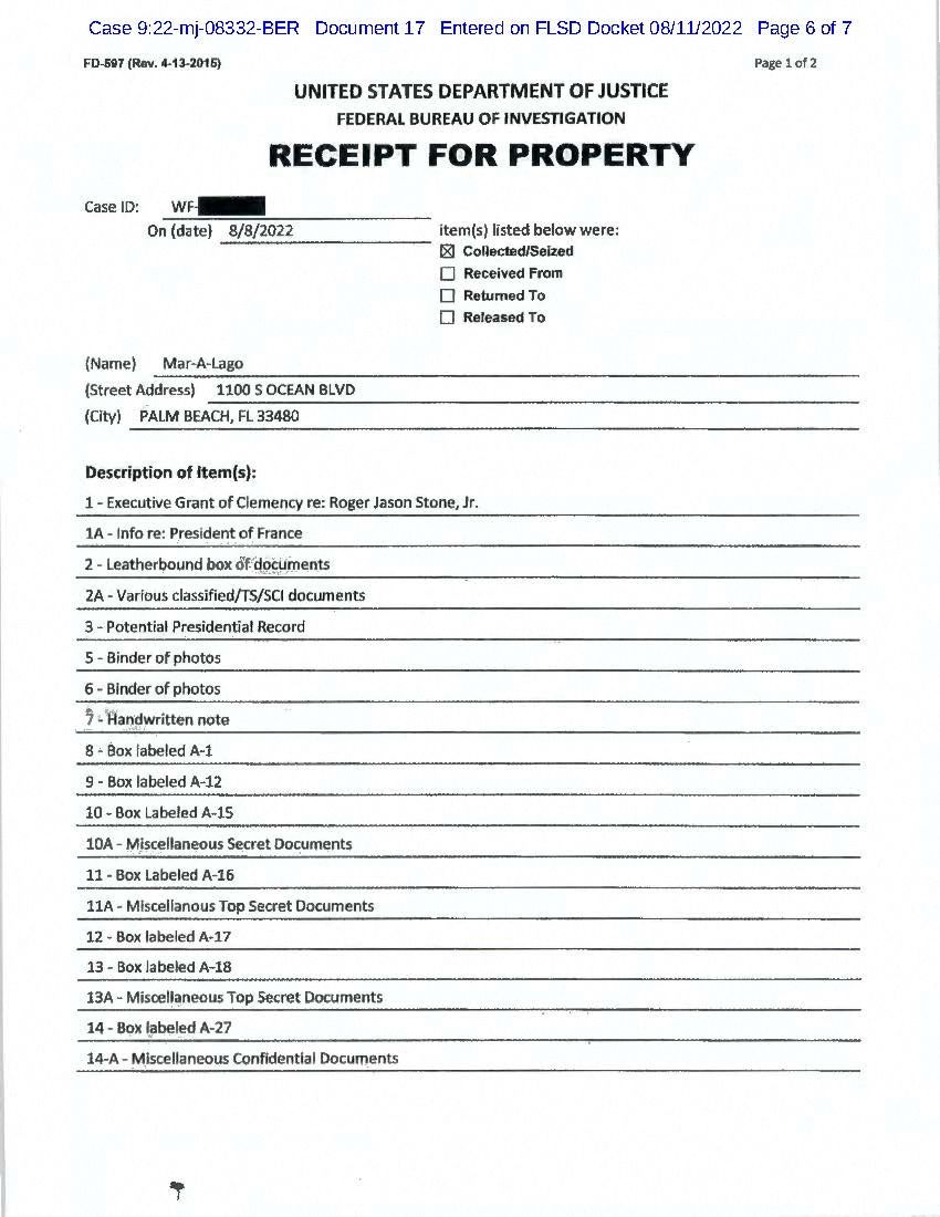 Los agentes del FBI se llevaron más de 30 artículos, incluidas más de 20 cajas, carpetas con fotos, una nota escrita a mano y la concesión ejecutiva de clemencia para el aliado de Trump y asesor de toda la vida, Roger Stone, según mostró una lista de artículos retirados de la propiedad. También se incluyó en la lista información sobre el “Presidente de Francia”.
