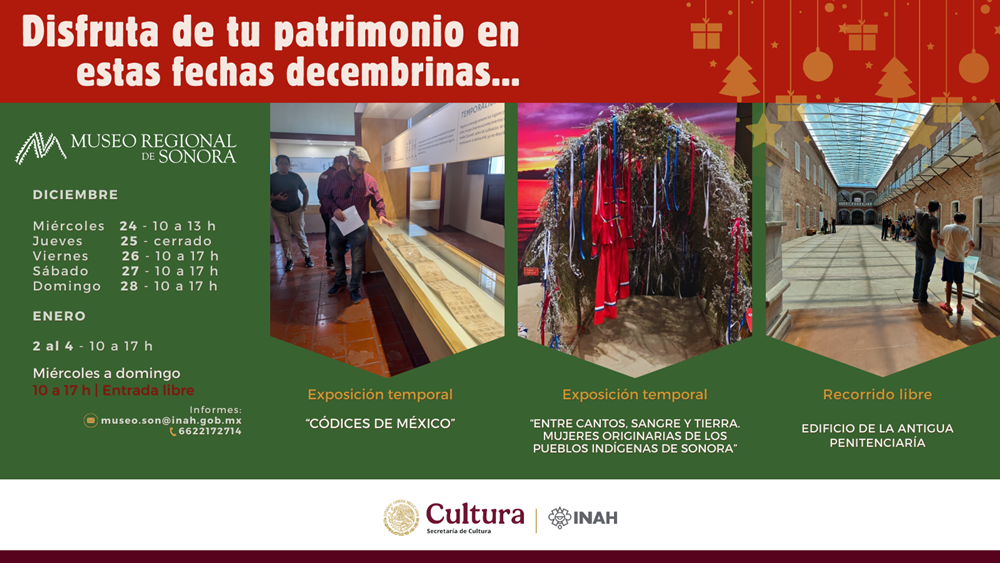 Hermosillo, Sonora. – El Museo Regional de Sonora, invita en este periodo vacacional a recorrer las instalaciones del edificio histórico de la Antigua Penitenciaria del Estado, cerrando las celebraciones del 40 aniversario, con dos exposiciones temporales recién inauguradas como lo son “Códices de México” y “Entre cantos, sangre y tierra. Mujeres originarias de los pueblos indígenas de Sonora”, durante los días festivos navideños.