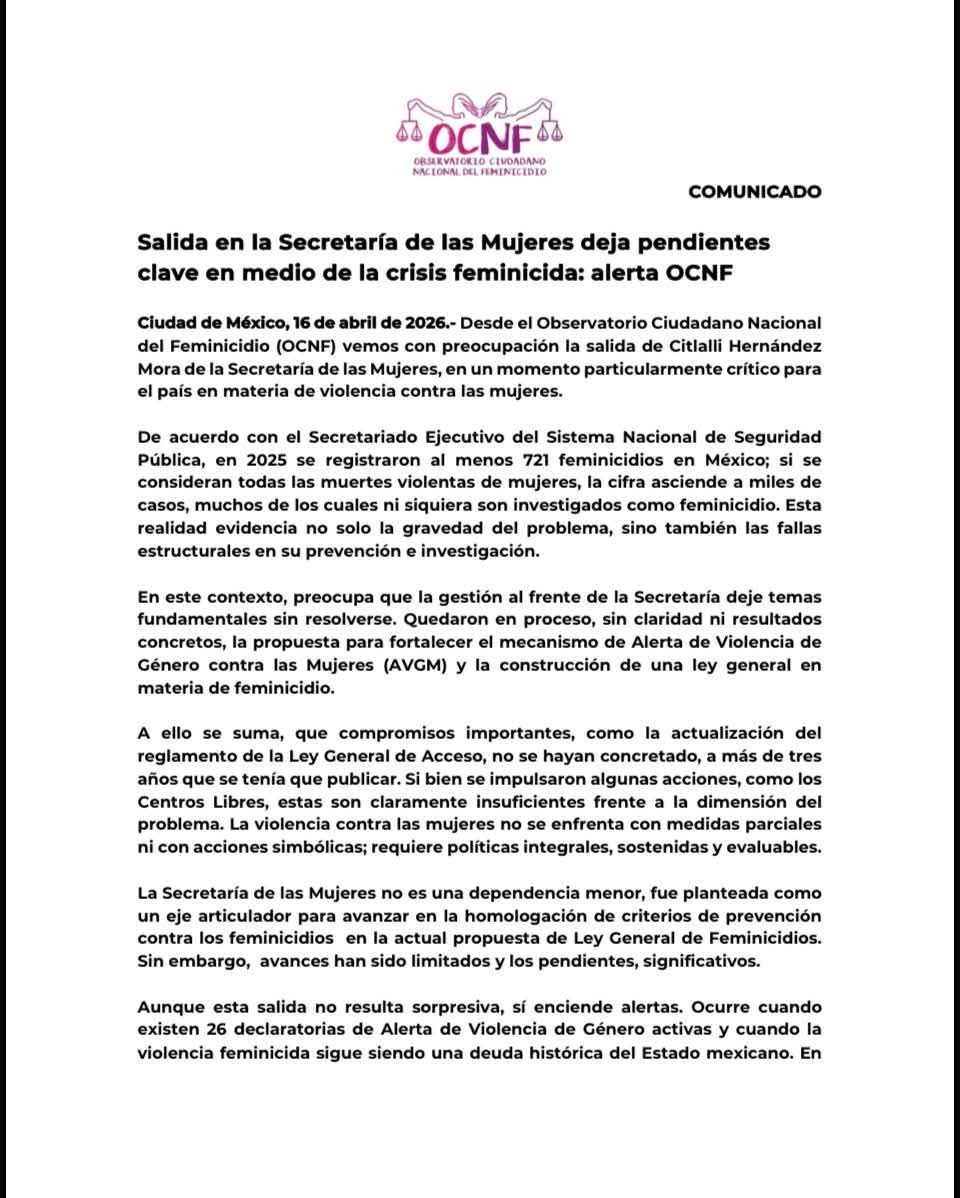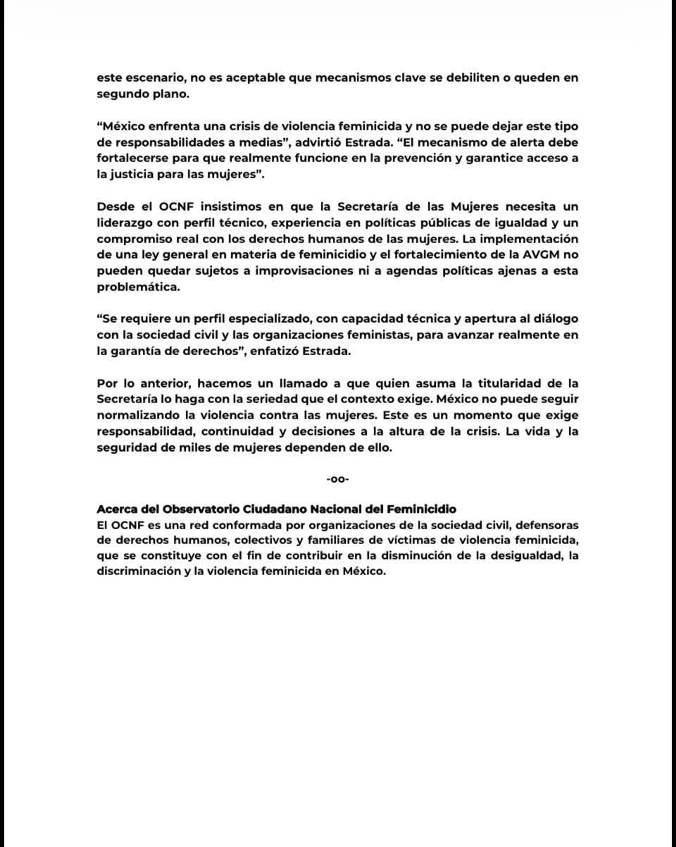 “El país enfrenta una crisis de violencia feminicida y no se pueden dejar responsabilidades a medias”, advirtió el OCNF, al insistir en que el mecanismo de alerta debe fortalecerse para garantizar prevención y acceso a la justicia. Asimismo, hizo un llamado a que quien asuma la titularidad de la Secretaría cuente con perfil técnico, experiencia en políticas de igualdad y compromiso con los derechos humanos de las mujeres.