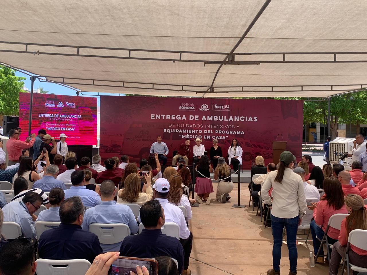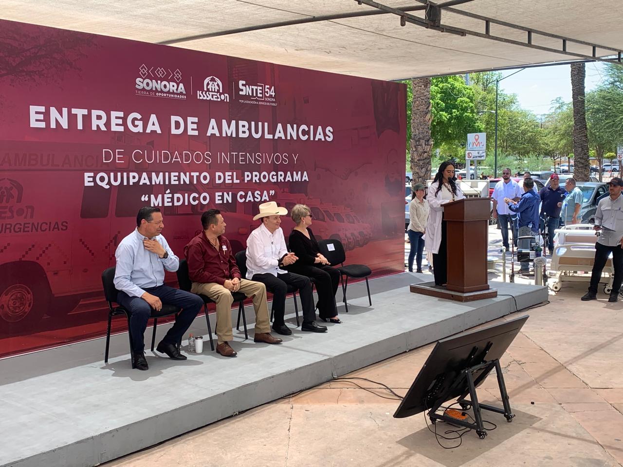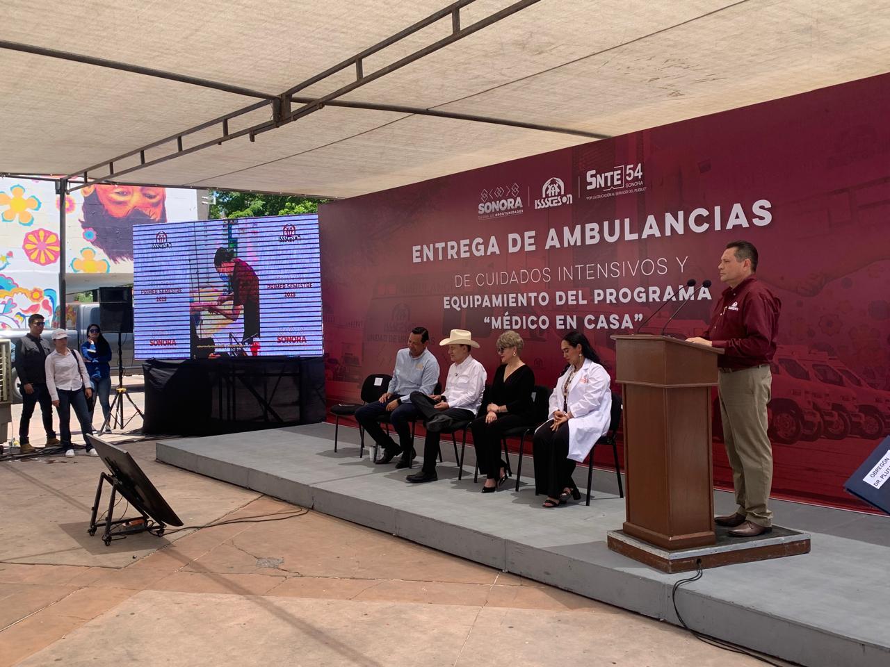 En evento realizado en la Plaza Alonso Vidal, en Hermosillo, el gobernador Alfonso Durazo Montaño encabezó la entrega de dos ambulancias de cuidados intensivos y una de cuidados intermedios, así como el relanzamiento del programa “Médico en Casa” del Instituto de Seguridad y Servicios Sociales de los Trabajadores del Estado de Sonora (Isssteson).