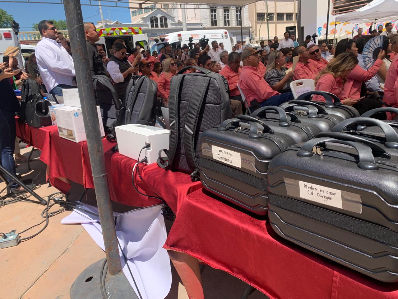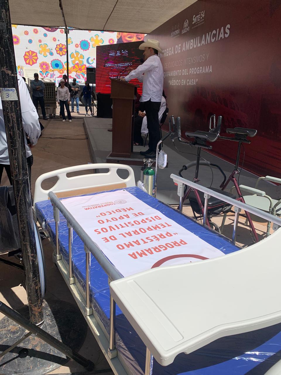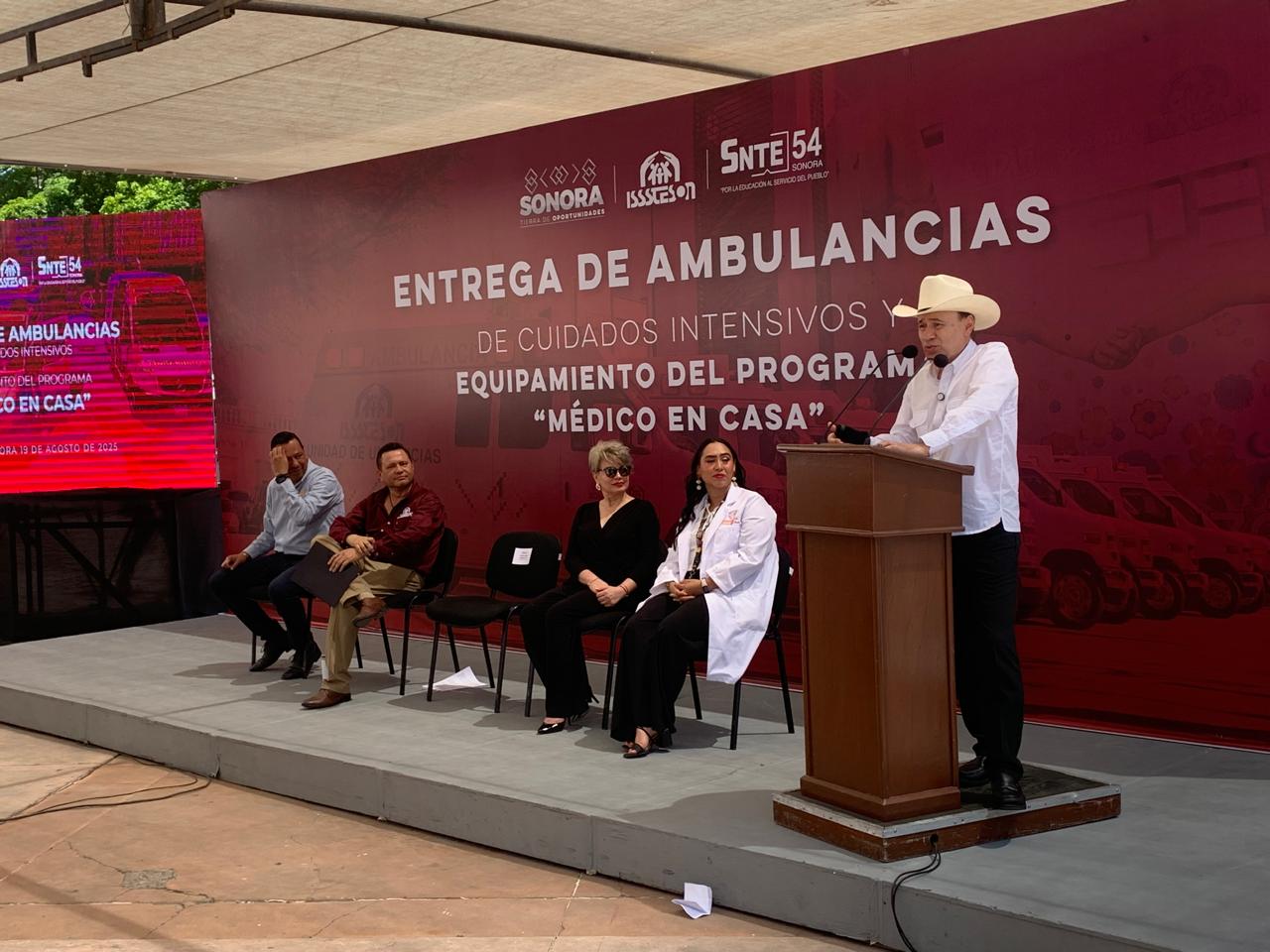 En evento realizado en la Plaza Alonso Vidal, en Hermosillo, el gobernador Alfonso Durazo Montaño encabezó la entrega de dos ambulancias de cuidados intensivos y una de cuidados intermedios, así como el relanzamiento del programa “Médico en Casa” del Instituto de Seguridad y Servicios Sociales de los Trabajadores del Estado de Sonora (Isssteson).