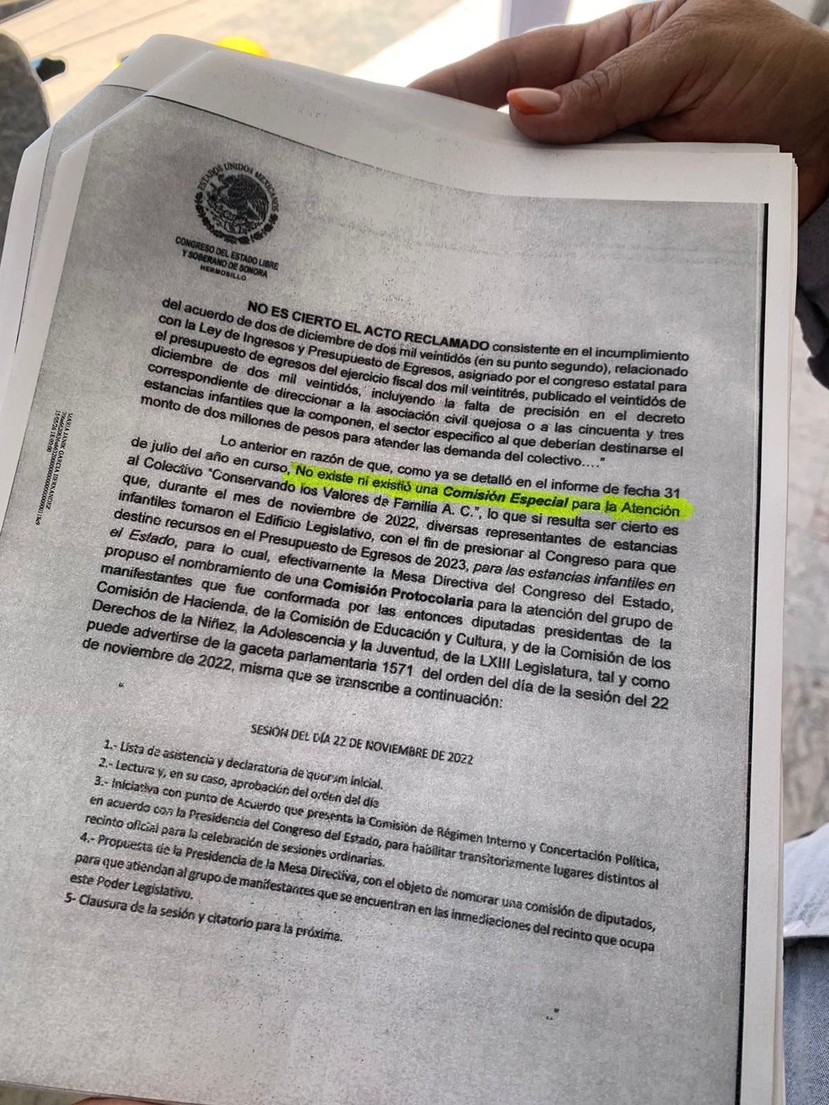 Villalobos López también denunció que en Sonora han presentado varias demandas ante el Congreso del Estado, el Ejecutivo estatal, el Ayuntamiento de Hermosillo e incluso a nivel federal, debido a incumplimientos de acuerdos. En lo que toca al Congreso, explica que una comisión legislativa se comprometió en 2022 a darle seguimiento a sus peticiones, que entre otras consistía en asignar recursos a las estancias que representa. Sin embargo, el presupuesto fue entregado a guarderías registradas como comercios, dejando fuera a quienes protestaron, lo que motivó a una demanda legal.