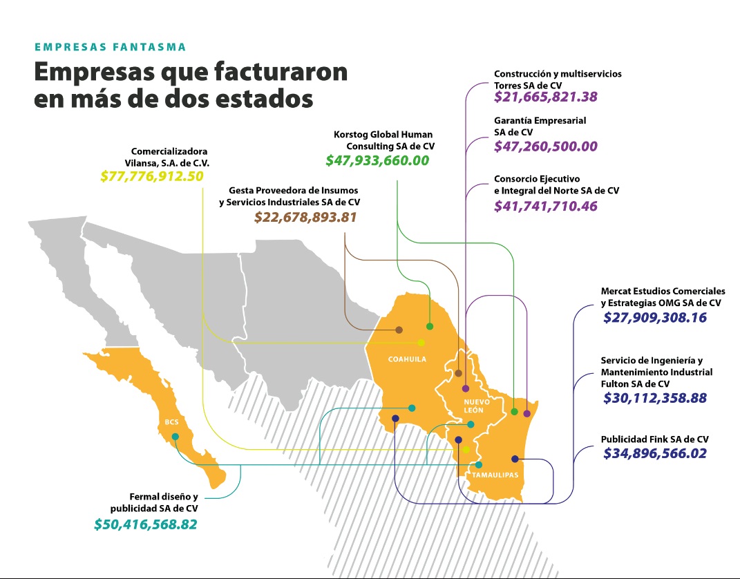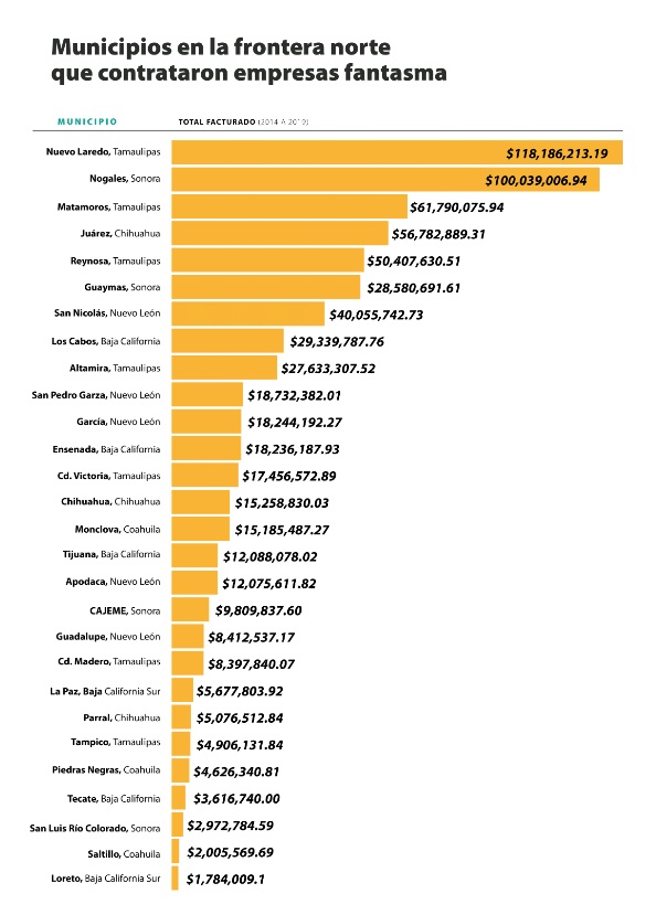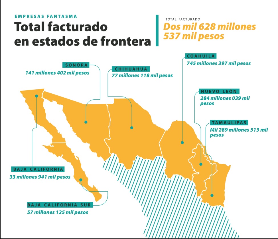 Entre 2014 y 2019 gobiernos de estados y municipios fronterizos del norte de México facturaron al menos 2 mil 628 millones de pesos (unos 120 millones de dólares) con 536 empresas fantasma.