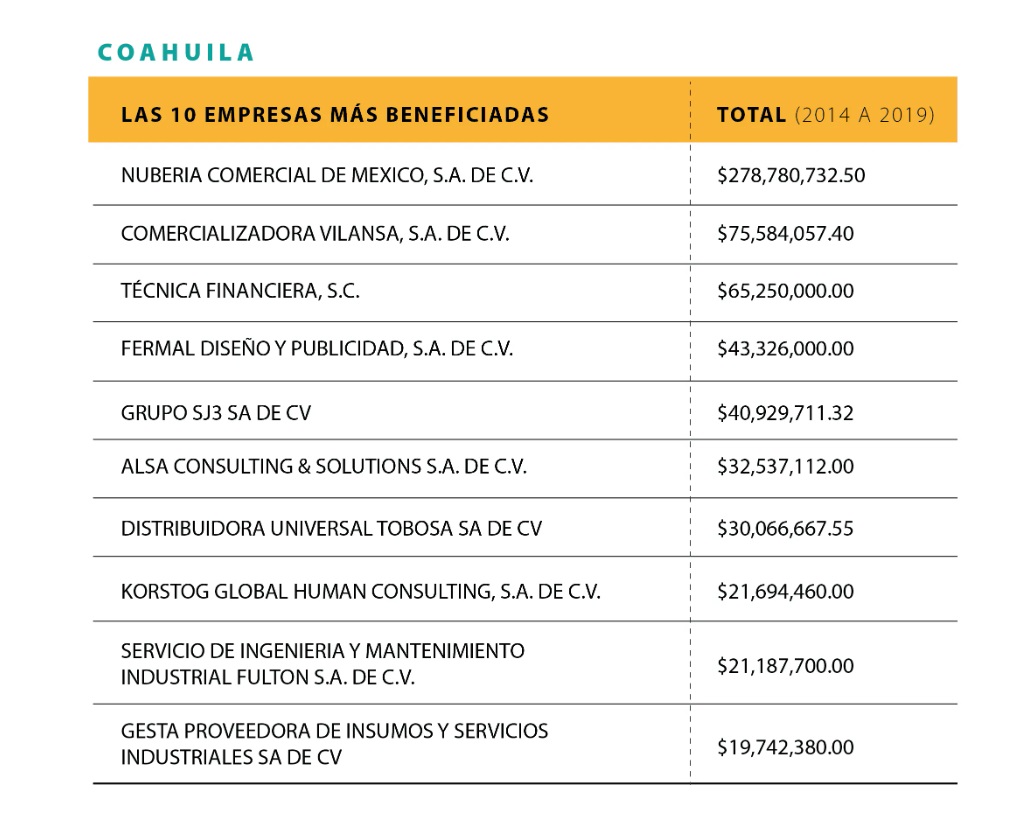 En el periodo analizado, entre 2014 y 2019, el gobierno estatal y tres de sus principales municipios: Saltillo, Monclova y Piedras Negras suman 745 millones 397 mil pesos en servicios contratados con 144 personas físicas y morales boletinadas por el Servicio de Administración Tributaria.