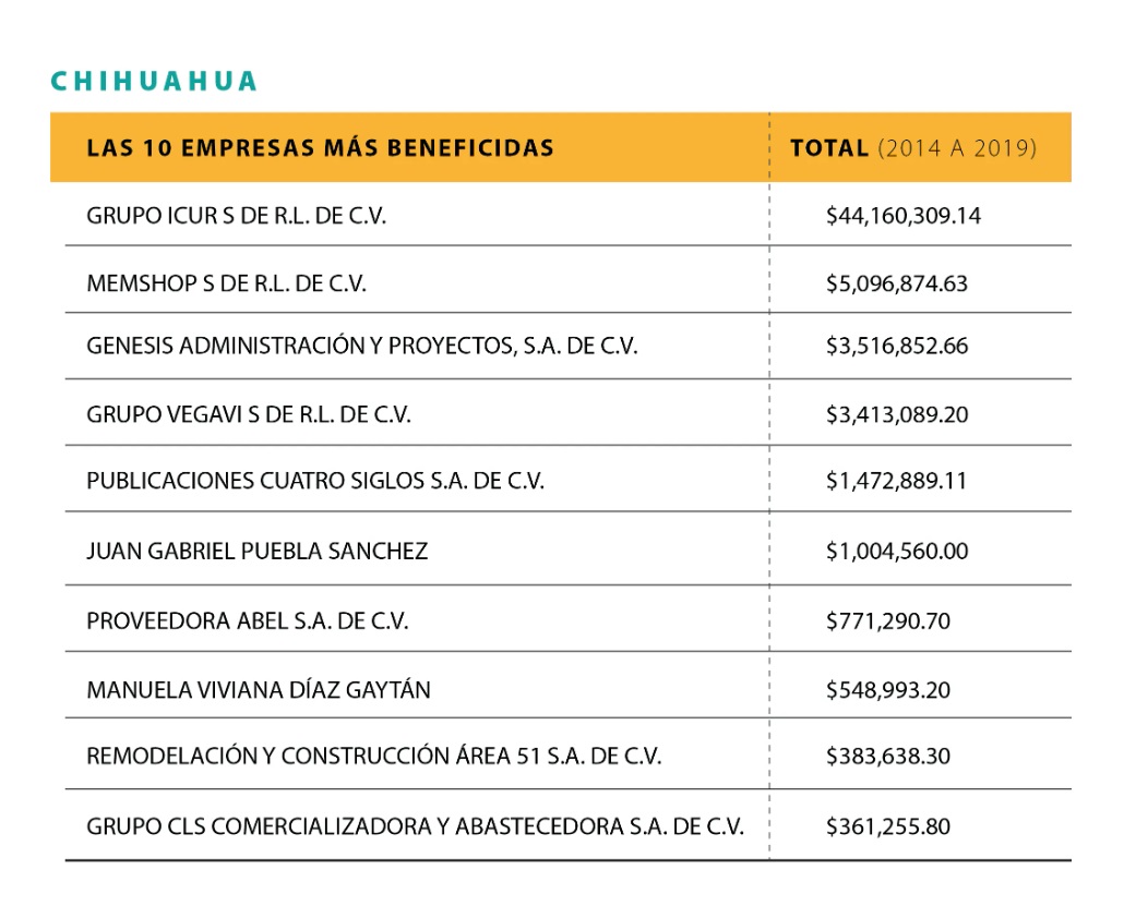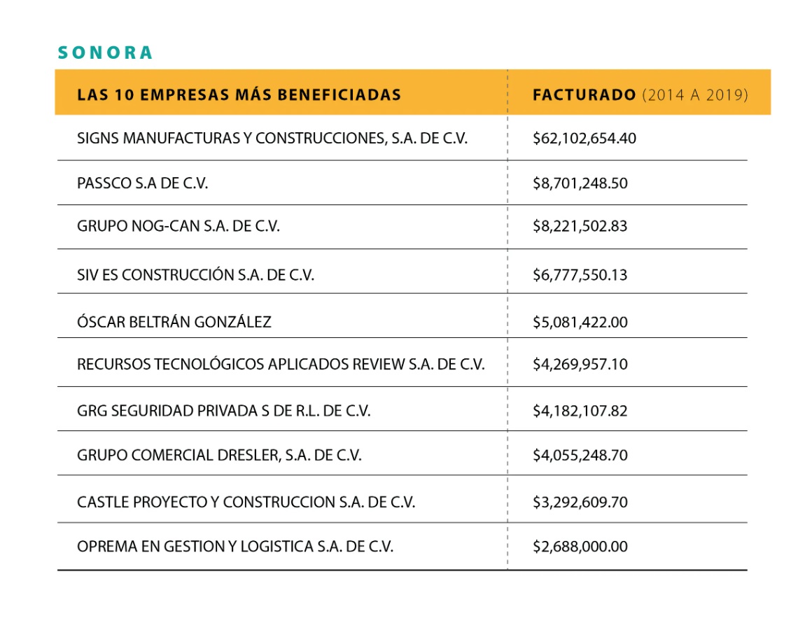 En este periodo el gobierno estatal realizó la mayor cantidad de operaciones con las empresas Fermal Diseño y Publicidad SA de CV, que le emitió facturas por cinco millones 237 mil pesos, y Ámbito Constructivo S de RL de CV, que facturó cuatro millones 253 mil pesos.
