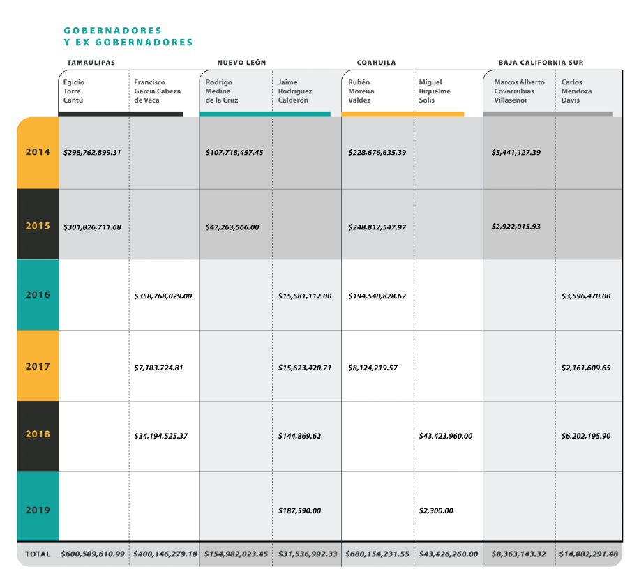 El uso de las empresas de papel se convirtió en una práctica común en este país. Los estados de la frontera no fueron la excepción. Los gobiernos comandados por los ex gobernadores Egidio Torre Cantú, de Tamaulipas (2011-2016); Marcos Alberto Covarrubias Villaseñor, de Baja California Sur (2011-2015); Rodrigo Medina de la Cruz, de Nuevo León (2009-2015), y Rubén Moreira Valdez, de Coahuila (2011-2017) acumularon cientos de millones de pesos pagados a empresas que ahora se hallan boletinadas por el SAT.