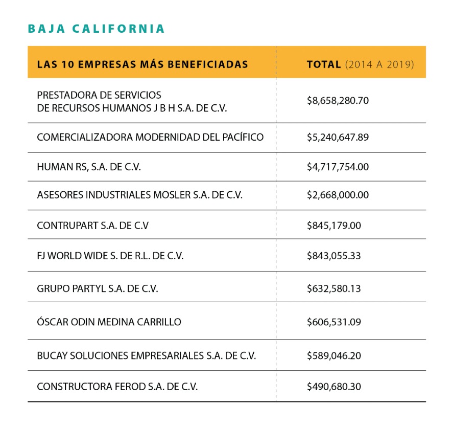 De entre las 50 empresas con las que los municipios de Baja California tuvieron operaciones destacó Prestadora de Servicios de Recursos Humanos JBH SA de CV, la cual comenzó a ser investigada por el SAT en mayo de 2016, pero meses antes había recibido ocho millones 658 mil pesos del gobierno de Ensenada.