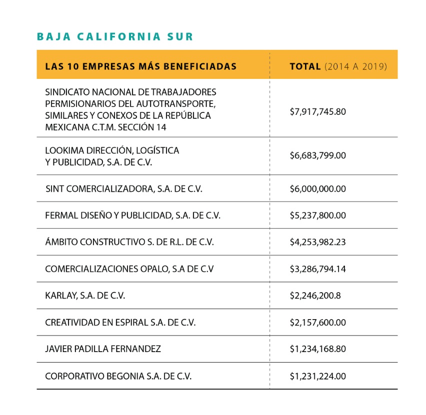 De las siete entidades analizadas, Baja California Sur es la que menor monto registró en las operaciones con empresas fantasma. Entre el gobierno estatal y tres municipios, La Paz, Loreto y Los Cabos, en la entidad se pagaron 57 millones 125 mil pesos a 76 empresas detectadas por el SAT, entre ellas un sindicato presuntamente afiliado a la Confederación de Trabajadores de México (CTM).