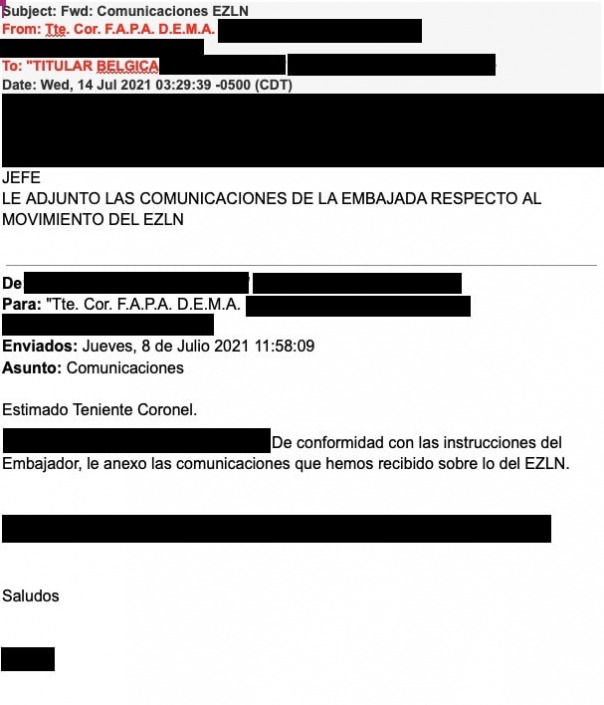 Las embajadas y agregadurías militares de México en Europa dieron un puntual seguimiento, por separado, a la delegación del Ejército Zapatista de Liberación Nacional que viajó a la región en 2021. No obstante, comunicaciones internas hackeadas a la Secretaría de la Defensa Nacional revelan que a ésta le fueron entregados reportes internos elaborados por las representaciones diplomáticas, en los que se llega a identificar a activistas y organizaciones europeas simpatizantes con el zapatismo. Por razones de seguridad, este medio decidió omitir los nombres de los funcionarios y los activistas mencionados en los mensajes.