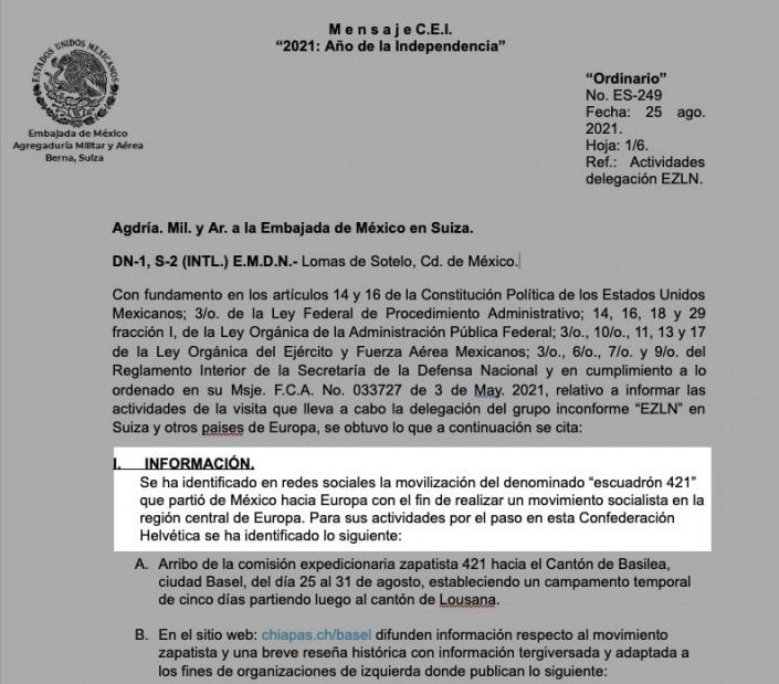 Por su parte, la SEDENA realizó su propio monitoreo del paso de los zapatistas por Europa al menos desde el 3 de mayo. Así lo revela el oficio ordinario No. ES-249 que el agregado Militar y Aéreo de la embajada mexicana en Berna, Suiza envió a su superior en la Ciudad de México “en cumplimiento a lo ordenado en su Msje. F.C.A. No. 033727 de 3 de May. 2021, relativo a informar las actividades de la visita que lleva a cabo la delegación del grupo inconforme “EZLN” en Suiza y otros países de Europa”.