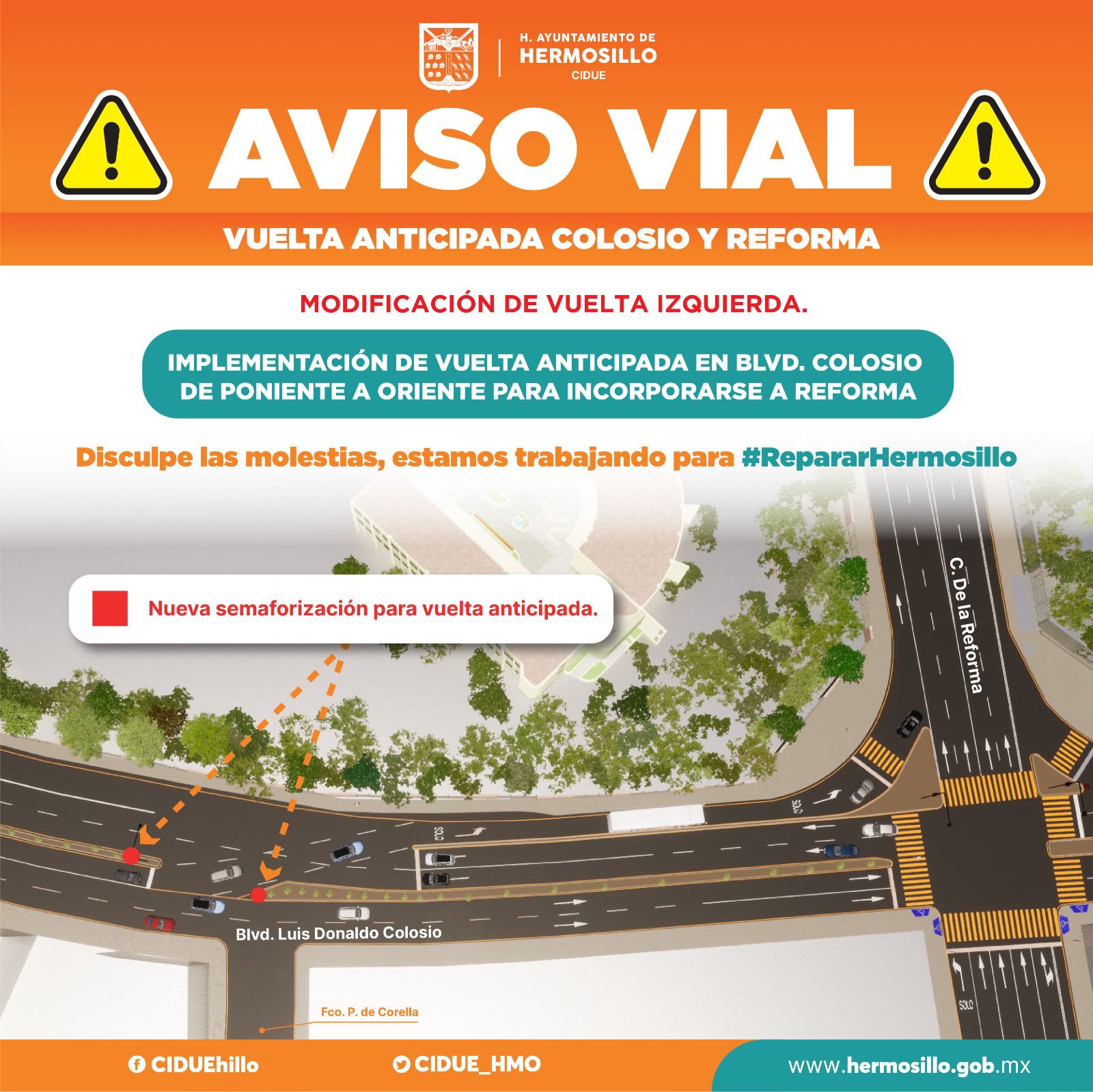 La Coordinación de Infraestructura, Desarrollo Urbano y Ecología (CIDUE) del Ayuntamiento de Hermosillo afina los últimos detalles para la vuelta anticipada a la izquierda que empezará a operar a partir del próximo lunes en el cruce de Reforma y Colosio.