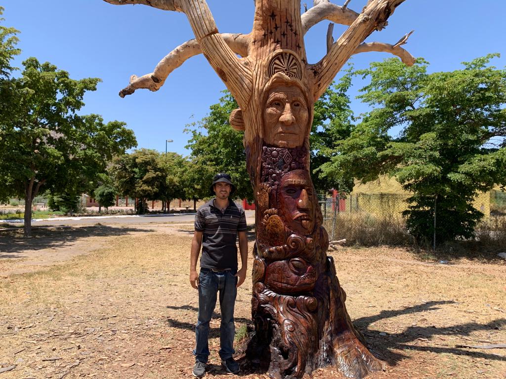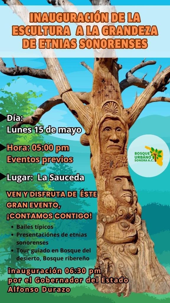 El próximo 15 de mayo a partir de las 5.00 pm será la inauguración de la Escultura monumental sobre un eucalipto seco que resalta la grandeza de los pueblos originarios de Sonora, y que fue esculpida por Mario Alejandro Moreno en la antigua entrada principal del Parque La Sauceda.
