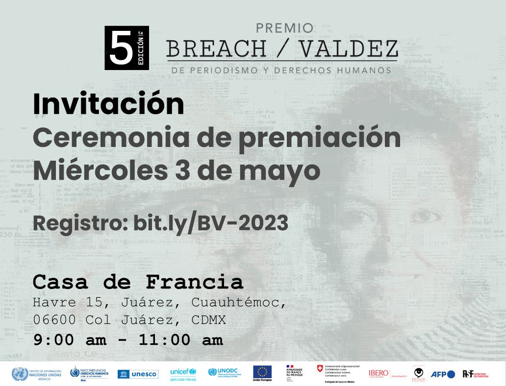 Las organizaciones convocantes de la 5ta edición del Premio Breach / Valdez de periodismo y Derechos Humanos, invitan a la ceremonia de premiación a celebrarse el miércoles 3 de mayo de 2023, a las 09:00 hrs., en la Casa de Francia, Ciudad de México.