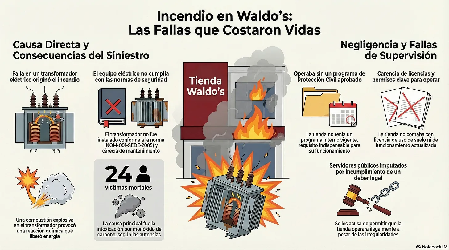 Los documentos judiciales no apuntan a un único culpable, sino que describen una compleja “red de responsabilidades” que abarca tanto a la esfera de ejecutivos y gerentes de Waldo’s Dolar Mart de México S.A. de C.V. como al gobierno estatal y municipal. La fiscalía argumenta que la tragedia fue el resultado de una falla sistémica en la que las acciones y omisiones de muchas personas contribuyeron al desastre.