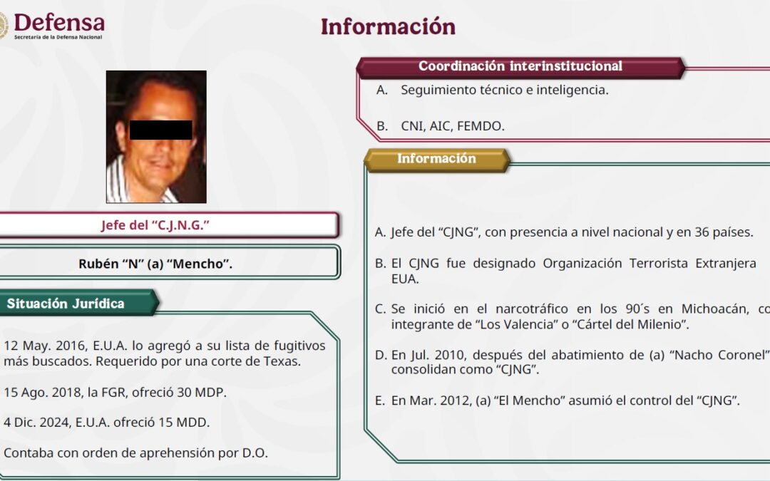 En un documento de cuatro hojas, una de ellas usada para el titulo “Detención de Rubén Oseguera Cervantes (a) ´El Mencho´ jefe del ´CJNG´”, el general Trevilla lo identifica como jefe de la organización con presencia a nivel nacional y en 36 países y a que Estados Unidos desginó como como organización terrorista.