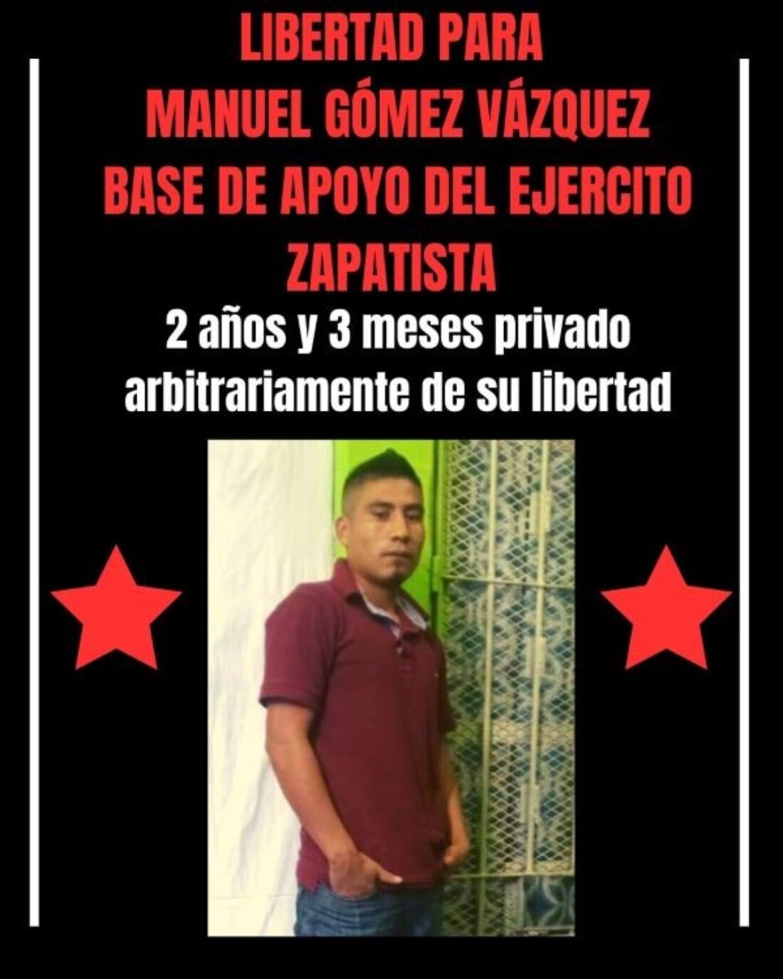 El Centro de Derechos Humanos Fray Bartolomé de Las Casas (Frayba), exige la libertad inmediata del Base de Apoyo del Ejército Zapatista de Liberación Nacional (EZLN), Manuel Gómez Vázquez (Manuel), quien lleva 2 años y 11 meses Privado Arbitrariamente de su Libertad (PAL) en el Centro Estatal de Reinserción Social de Sentenciados número 16 de Ocosingo, Chiapas.