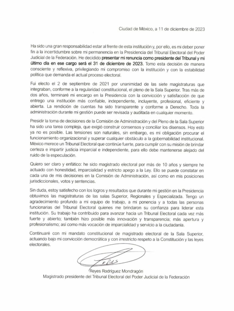 El magistrado presidente del Tribunal Electoral del Poder Judicial de la Federación (TEPJF), anunció su renuncia al máximo órgano electoral, dicha renuncia se hará efectiva el próximo 31 de diciembre