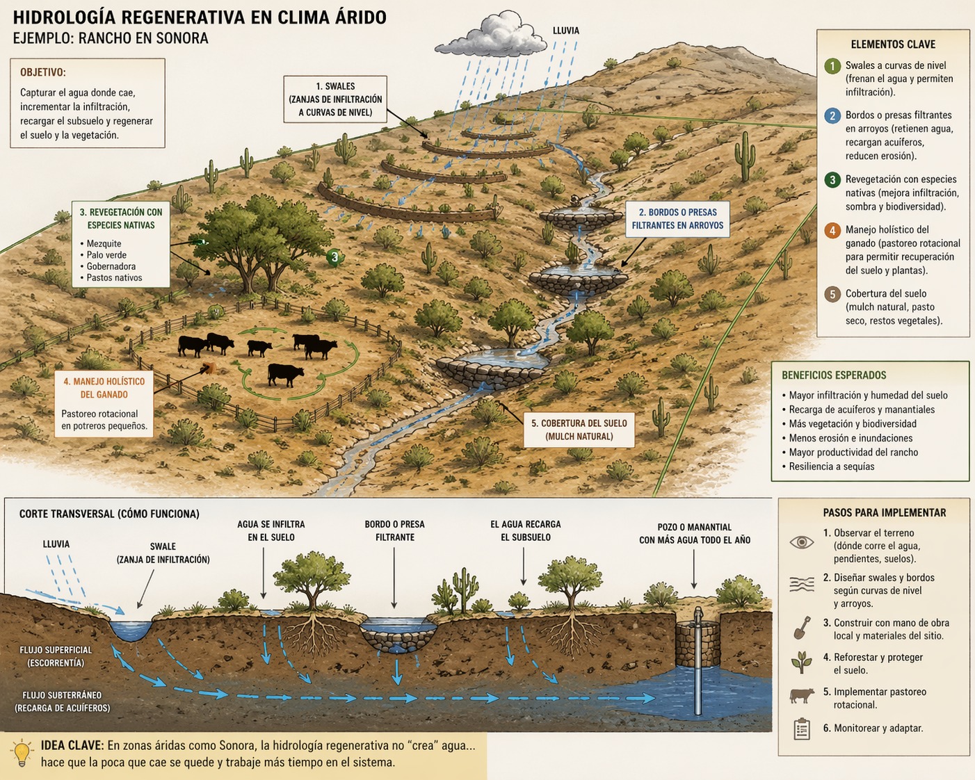 ¿De que se trata este concepto/acción investigación? Es un enfoque dentro del manejo del agua y la tierra que busca restaurar y mejorar los ciclos naturales del agua, en lugar de solo explotarlos o controlarlos. Está muy vinculada a prácticas de agricultura regenerativa y restauración de ecosistemas.