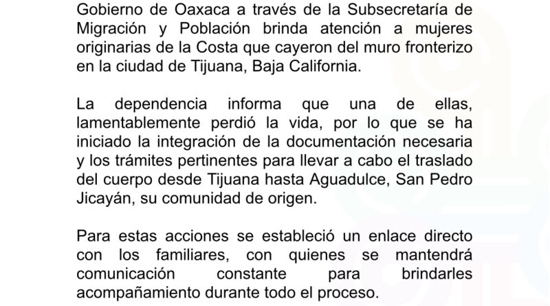 También informaron, que a través de la de la Subsecretaría de Migración y Población se brinda atención a las dos sobrevivientes mujeres originarias también de la costa oaxaqueñaLa dependencia informó, qué se estableció un enlace directo con los familiares, con quienes se mantiene comunicación constante para brindarles acompañamiento durante todo el proceso.