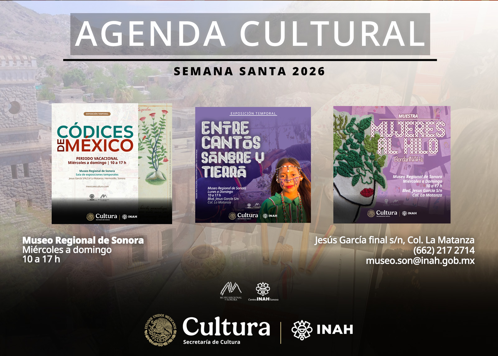 El Museo Regional de Sonora mantiene entrada gratuita de miércoles a domingo en un horario de 10:00 a 17:00 horas, con ajuste de cierre a las 16:00 horas los días 28 y 29 de marzo. Para la semana de Pascua, del 6 al 12 de abril, operará de manera regular, incluyendo el acceso a recorridos por la Antigua Penitenciaría. Para más información, se encuentran disponibles el teléfono (662) 217 2714 y el correo electrónico museo.son@inah.gob.mx.