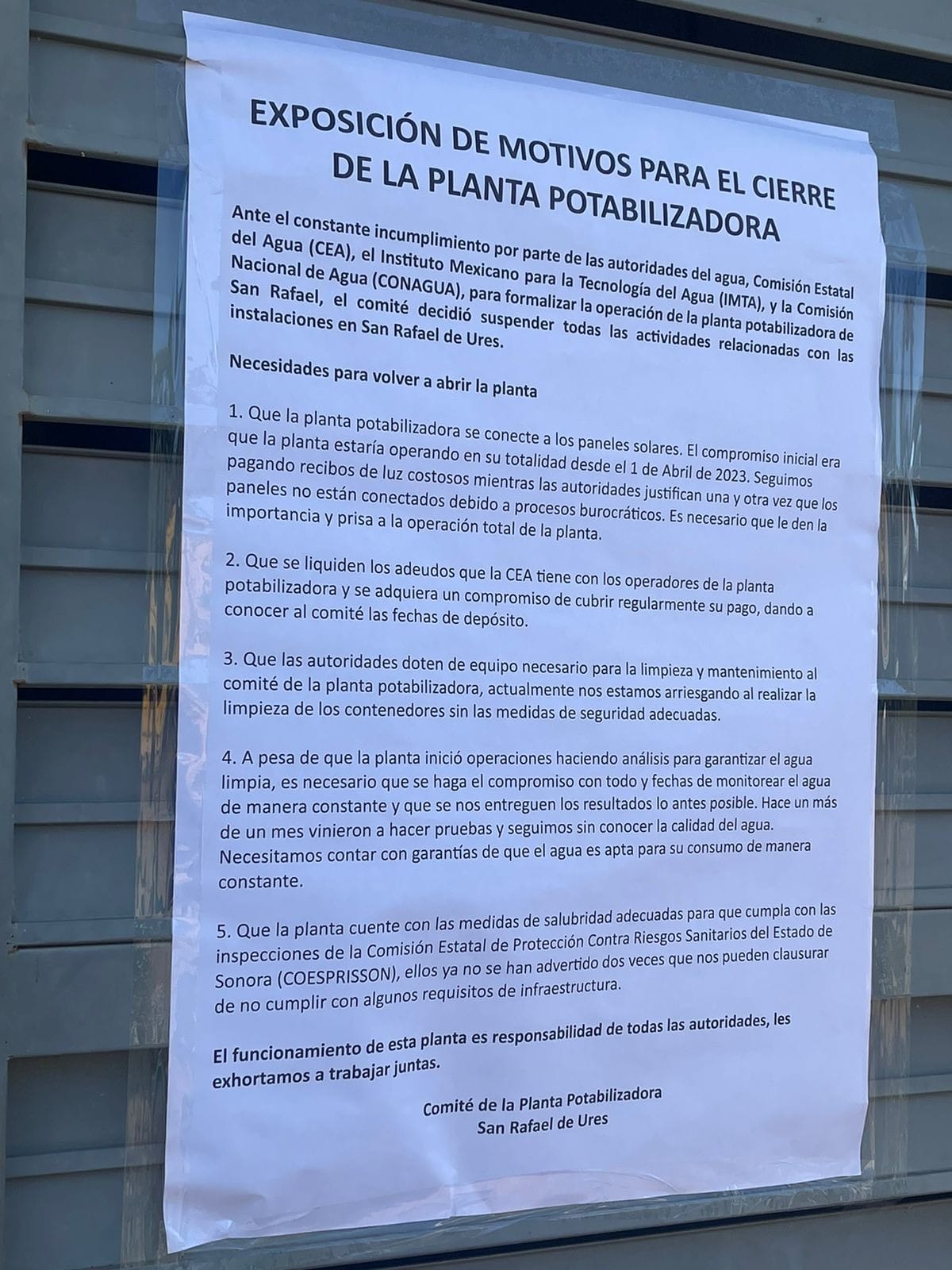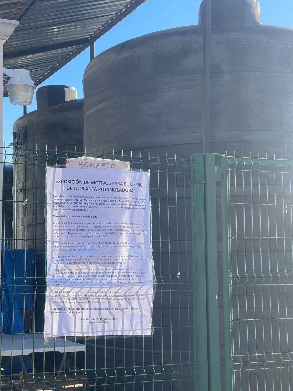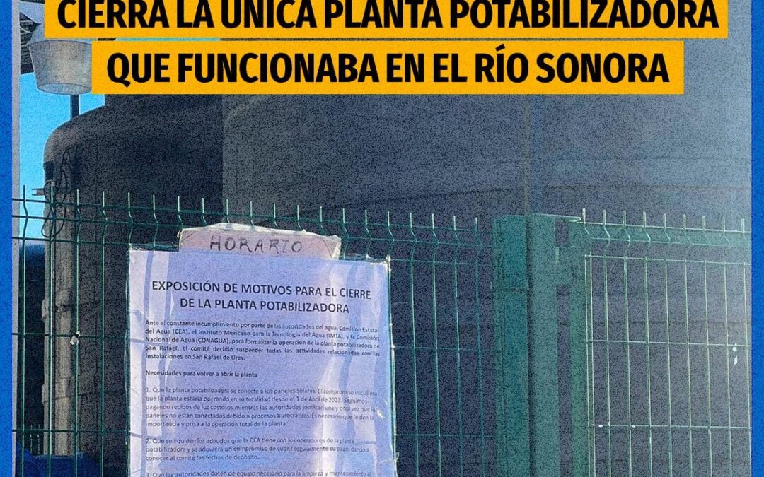 “El pasado lunes 20 de noviembre se suspendieron las actividades de la planta potabilizadora de San Rafael de Ures, derivado del incumplimiento de acuerdos por parte de las autoridades.