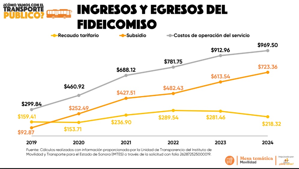 Esta combinación de tarifa fija e incremento de gastos ha hecho que el sistema dependa cada vez más de recursos públicos: actualmente, el 77% de los ingresos provienen de subsidio gubernamental. El estudio señala que el mantenimiento de una tarifa con enfoque social (vía subsidio) es común en los sistemas públicos de transporte, sin embargo, en el caso de Hermosillo, representa una carga creciente para el gobierno estatal que en 2024 destinó $720 millones para su cobertura ($730 por habitante).