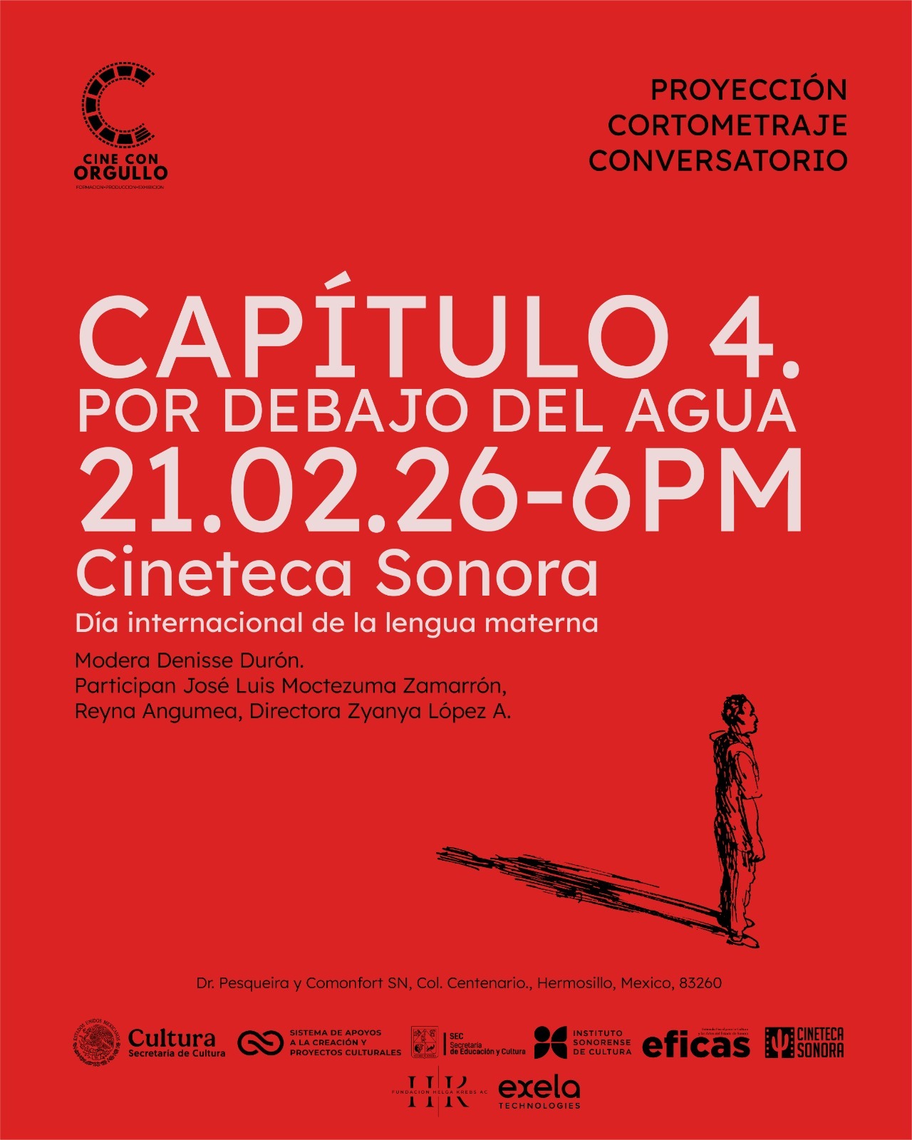 En el marco del Día Internacional de la Lengua Materna, la Cineteca Sonora será sede este sábado 21 de febrero, a las 18:00 horas, de la proyección gratuita del cortometraje documental “Capítulo 4. Por debajo del agua”, seguida de un conversatorio sobre memoria histórica, identidad y preservación lingüística.