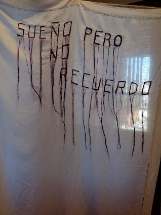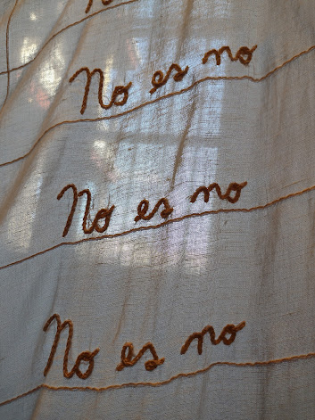 Igual nos encontramos una sábana bordada a lo largo y a lo ancho con la consigna “No es no”, que advertimos una faja de mujer, de entre un conjunto de ropa interior colgada pendiendo de una cuerda, como tendedero para secar la ropa recién lavada.