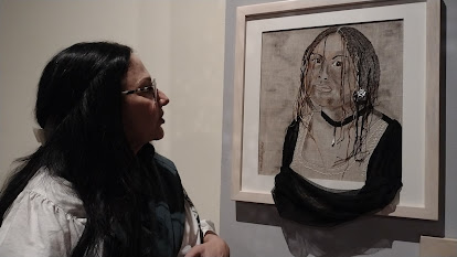 Cual si estuviera interpelando a la concurrencia con su mirada, Raquel Padilla Ramos ha sido inspiración de la artista plástica Elena Martínez Bolio, en una de las obras que forma parte de la exposición “Una larga hebra”.