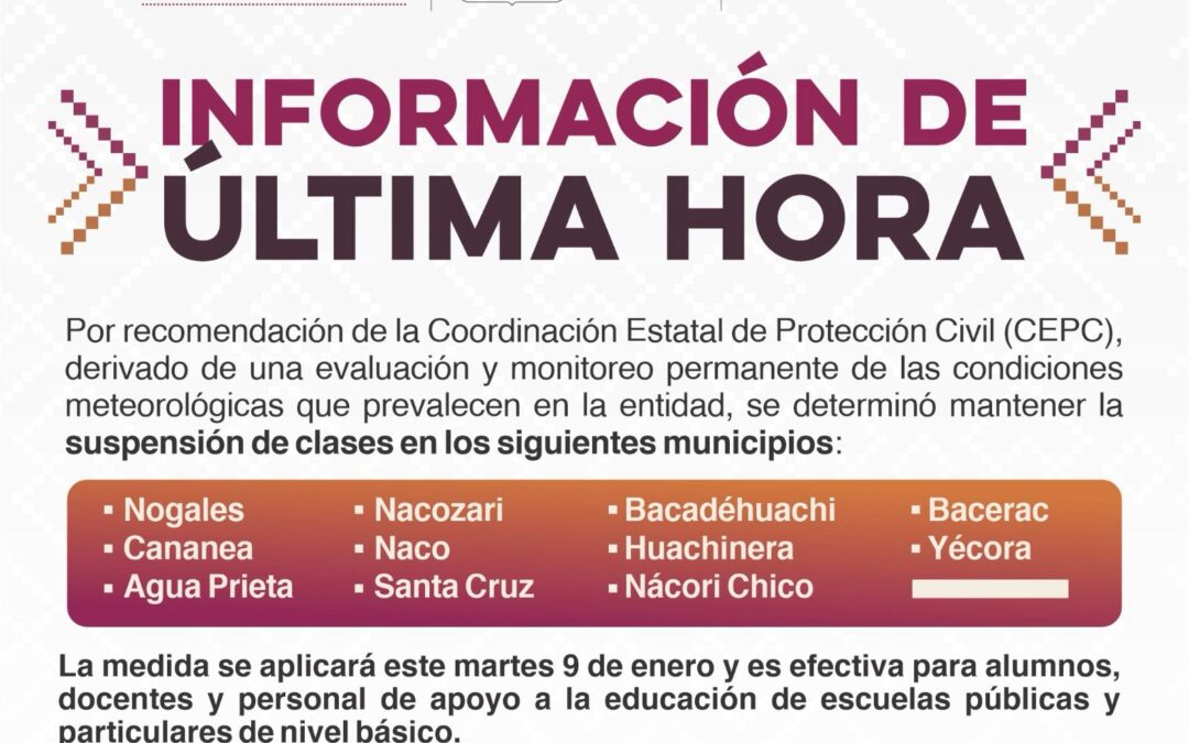 Por recomendación de la Coordinación Estatal de Protección Civil (CEPC), derivado de una evaluación y monitoreo permanente de las condiciones meteorológicas que prevalecen en la entidad, se determinó mantener la suspensión de clases en Nogales, Cananea, Agua Prieta, Nacozari, Naco, Santa Cruz, Bacadéhuachi, Huachinera, Nácori Chico, Bacerac y Yécora.