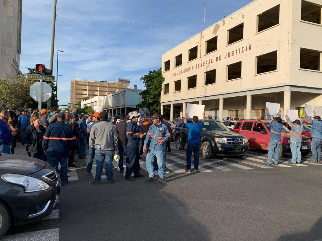 Trabajadores sindicalizados del Gobierno de Hermosillo se manifiestan en la avenida Rosales, esquina con Bulevar Hidalgo.