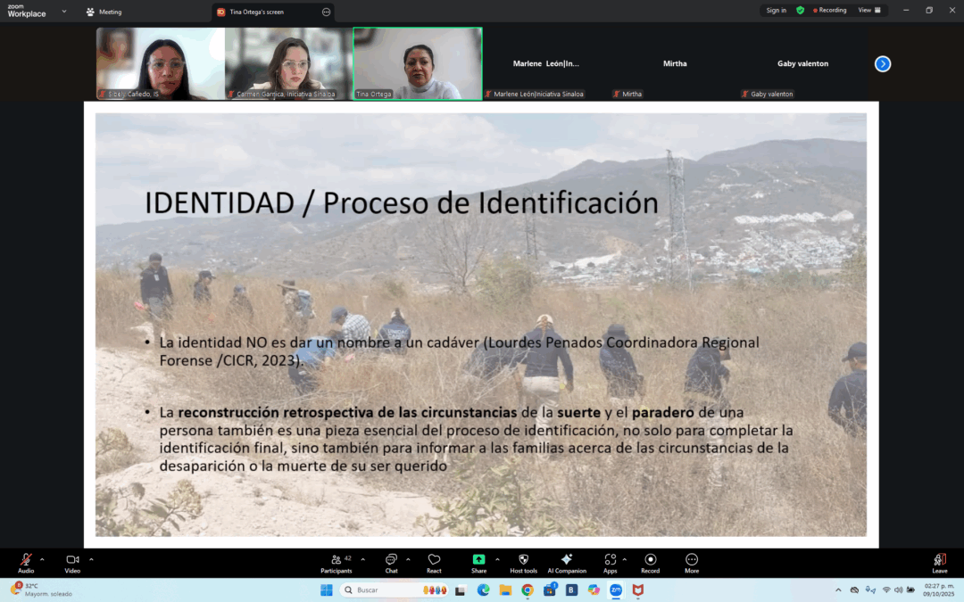 Durante el taller virtual “Fundamentos de antropología forense para la identificación de personas desaparecidas”, impartido por la antropóloga Albertina Ortega Palma, más de 50 familiares de personas desaparecidas y miembros de colectivos de Sinaloa y Sonora recibieron capacitación sobre identificación forense, seguridad en campo y derechos en procesos de entrega digna. La actividad fue organizada por Iniciativa Sinaloa con apoyo de la Embajada de Noruega en México.