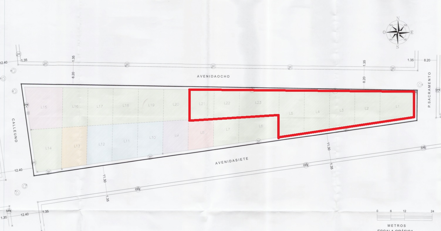 Los lotes referidos son del 1 al 5 y del 21 al 23, según el croquis, que según los funcionarios son unos mil metros cuadrados, alrededor de la cuarta parte del área total, que son 4 mil metros cuadrados. En esta parte, junto con la esquina norponiente, son las más boscosas.