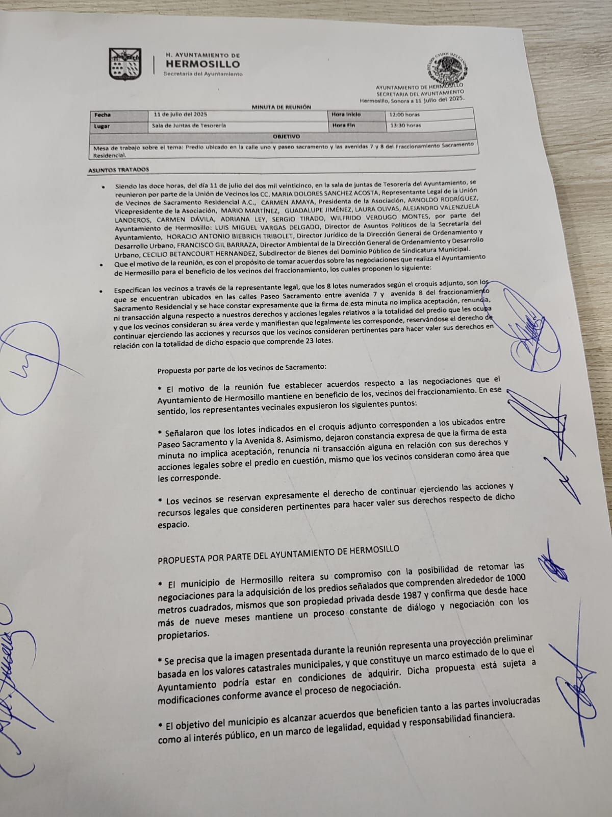 En la minuta firmada, las y los vecinos dejan en claro que el acuerdo no implica que dejarán de buscar, por las vías que consideren necesarias, que la totalidad de los lotes sean restituidos como área pública, pues sostienen que esos 4 mil metros son los que la empresa constructora Dinámica del Pacífico otorgó como área verde según la Ley, pero que fue vendida de forma irregular por la administración del Temo Balderrama, en 1987.